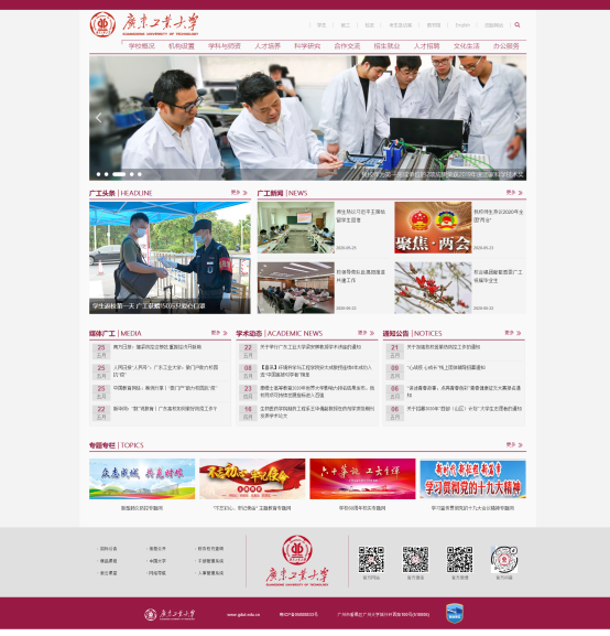 新版主页分为七大版块:广工映像(滚动大图)、广工头条、广工新闻、媒体广工、学术动态、通知公告、专题专栏,设置十个一级主导航栏:学校概括、线上买球官网(中国)官方网站、学科与师资、人才培养、科学研究、合作交流、招生就业、人才招聘、文化生活、办公服务,主页右上角还设置有图书馆、关键词搜索等上导航栏、左下角设置有招标公告等下导航栏。无论页面自上而下,还是自下而上滚动,系统设置的导航栏时刻待命,随时准备让你去到任何栏目,全方位守护你的需求。