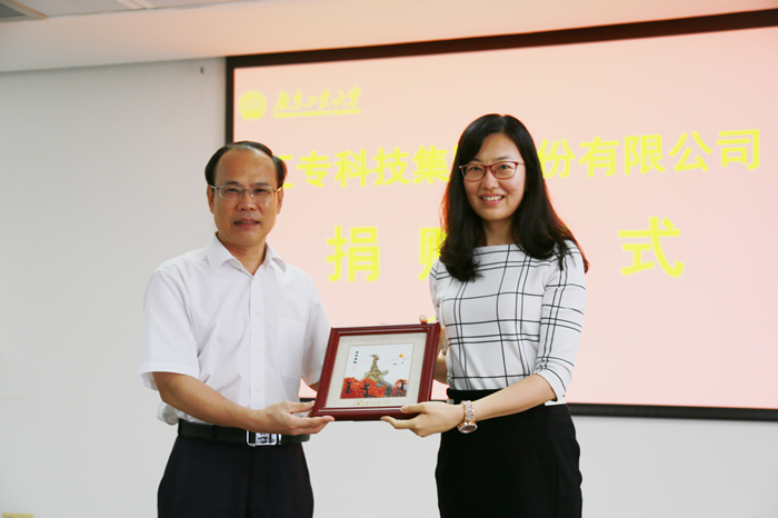 广工校长邱学青向汇专科技董秘蔡丹颁发捐赠证书