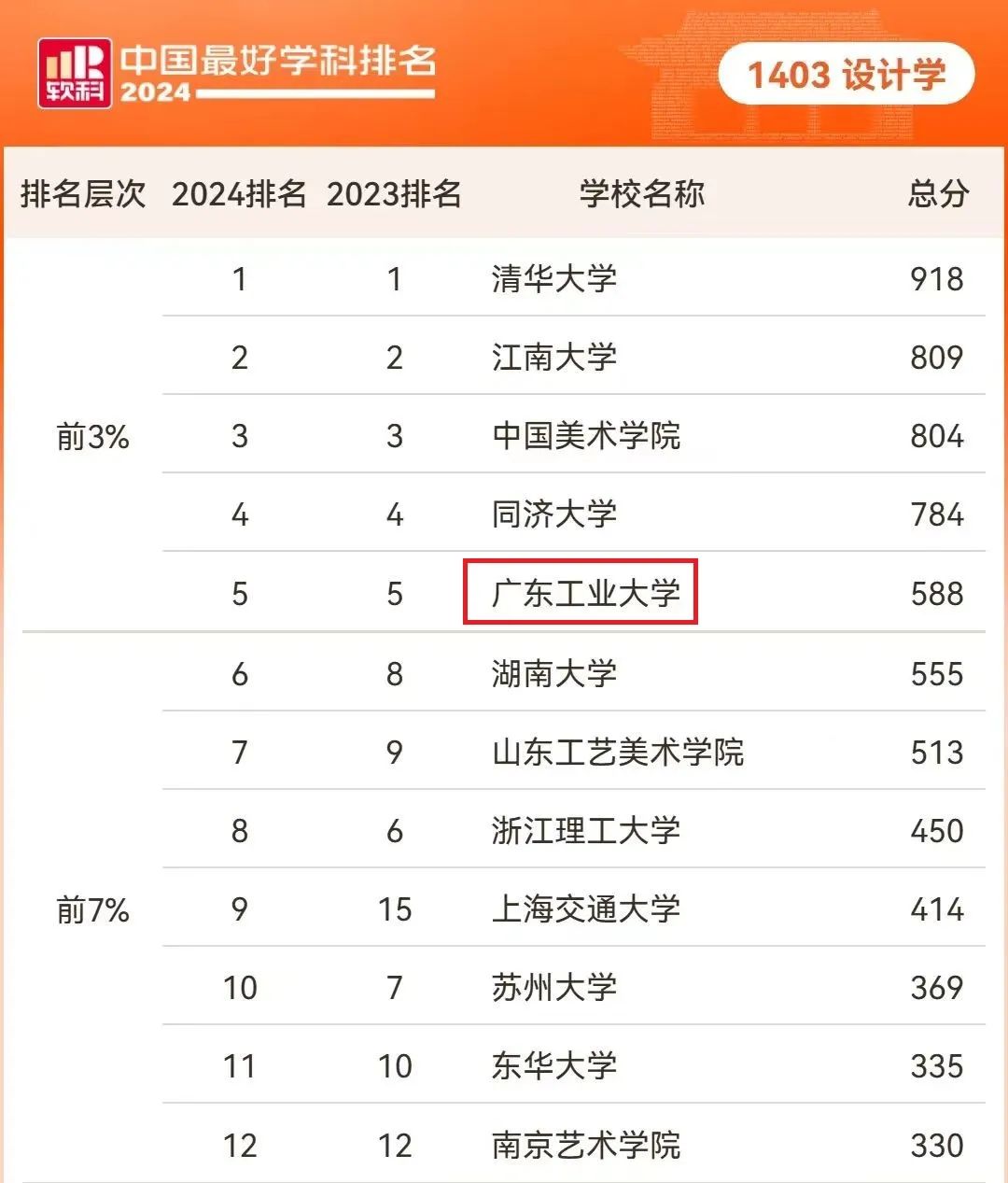 日前,高等教育评价专业机构软科发布“2024软科中国最好学科排名”,广工有21个学科上榜,上榜学科数位居全国75位,较去年提升6位。其中设计学位列全国前3%(全国排名第5名),保持在“中国顶尖学科”行列,为广东省内8个“中国顶尖学科”之一。