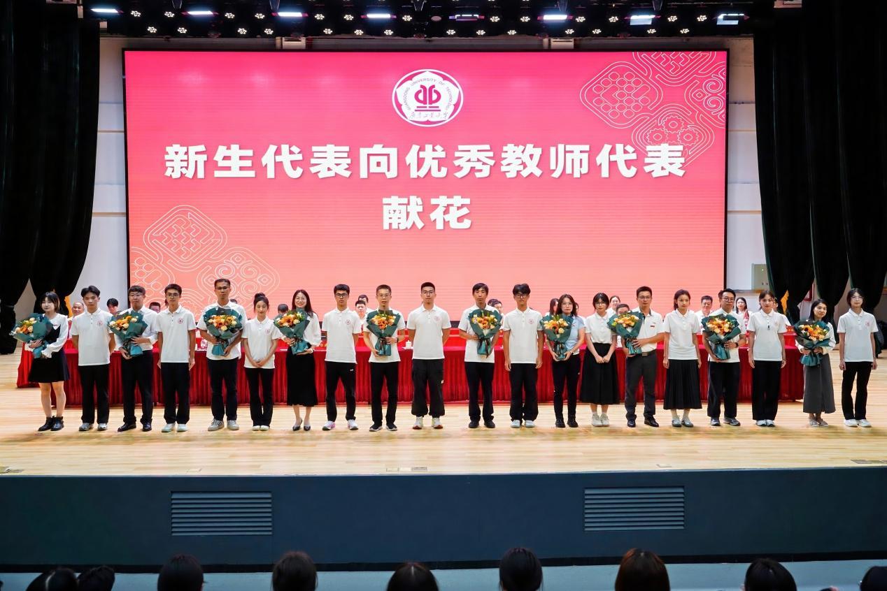 在教师节即将来临之际,新生代表向学校优秀教职工代表献花,向全校老师们致以诚挚的敬意。