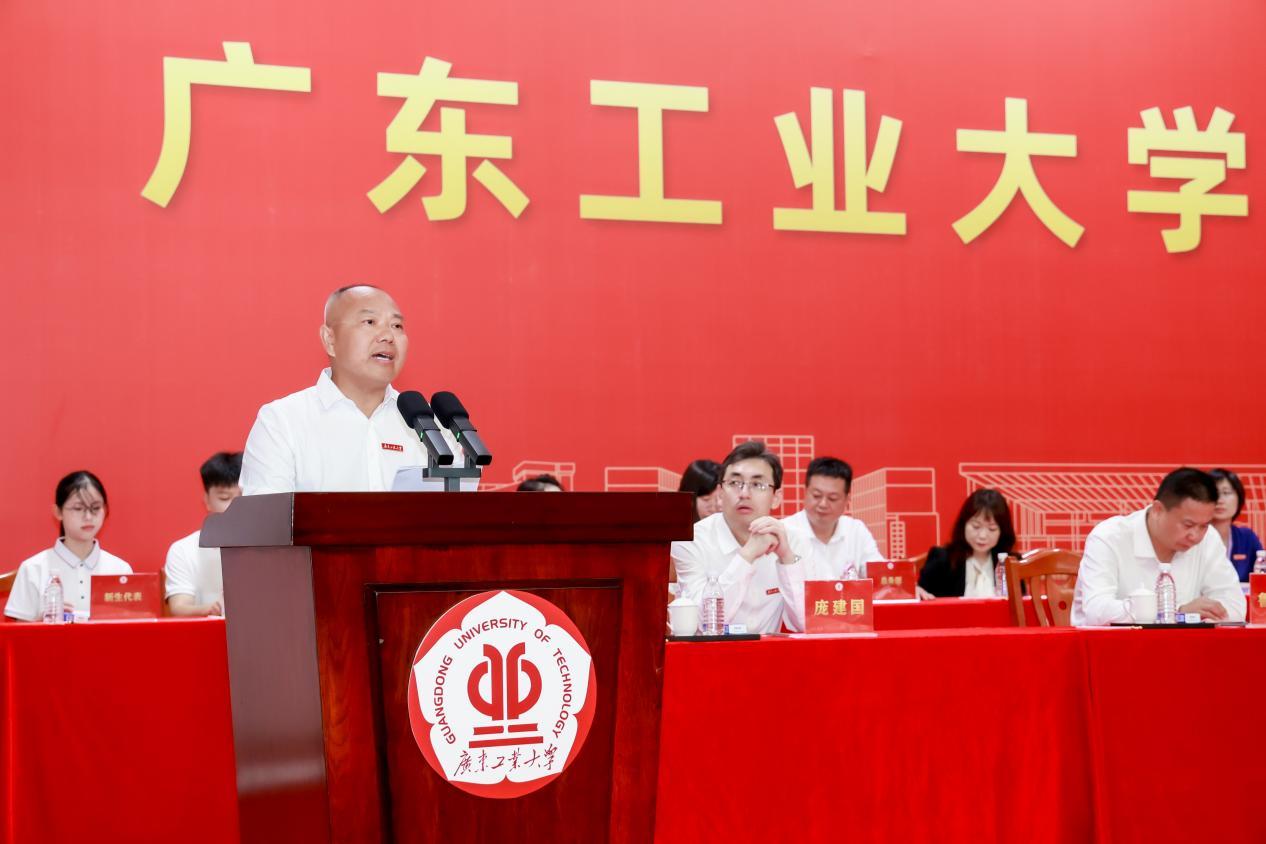 邱学青发表题为《把握时代机遇 攀撑不负韶华》的讲话。“广工是一所‘宝藏’学校,值得你们亲自探索。”他用“大、实、特、快”四个形容词带领大家认识广工,六十七年来,广工书写了扩规模、拓空间的成长之路,开启了上水平、攀高峰的攀撑征程,更谱写了全体广工人善抓天时、巧用地利、团结拼搏,在挑战中奋勇攀撑的辉煌篇章。如今,广工作为时代考卷的“破题者”,正以“勇攀高峰、撑天拄地”之势,抢抓机遇、聚力攻坚,加快推动学校跃升“双一流”,努力办好德智体美劳全面育人的“更好”大学。
