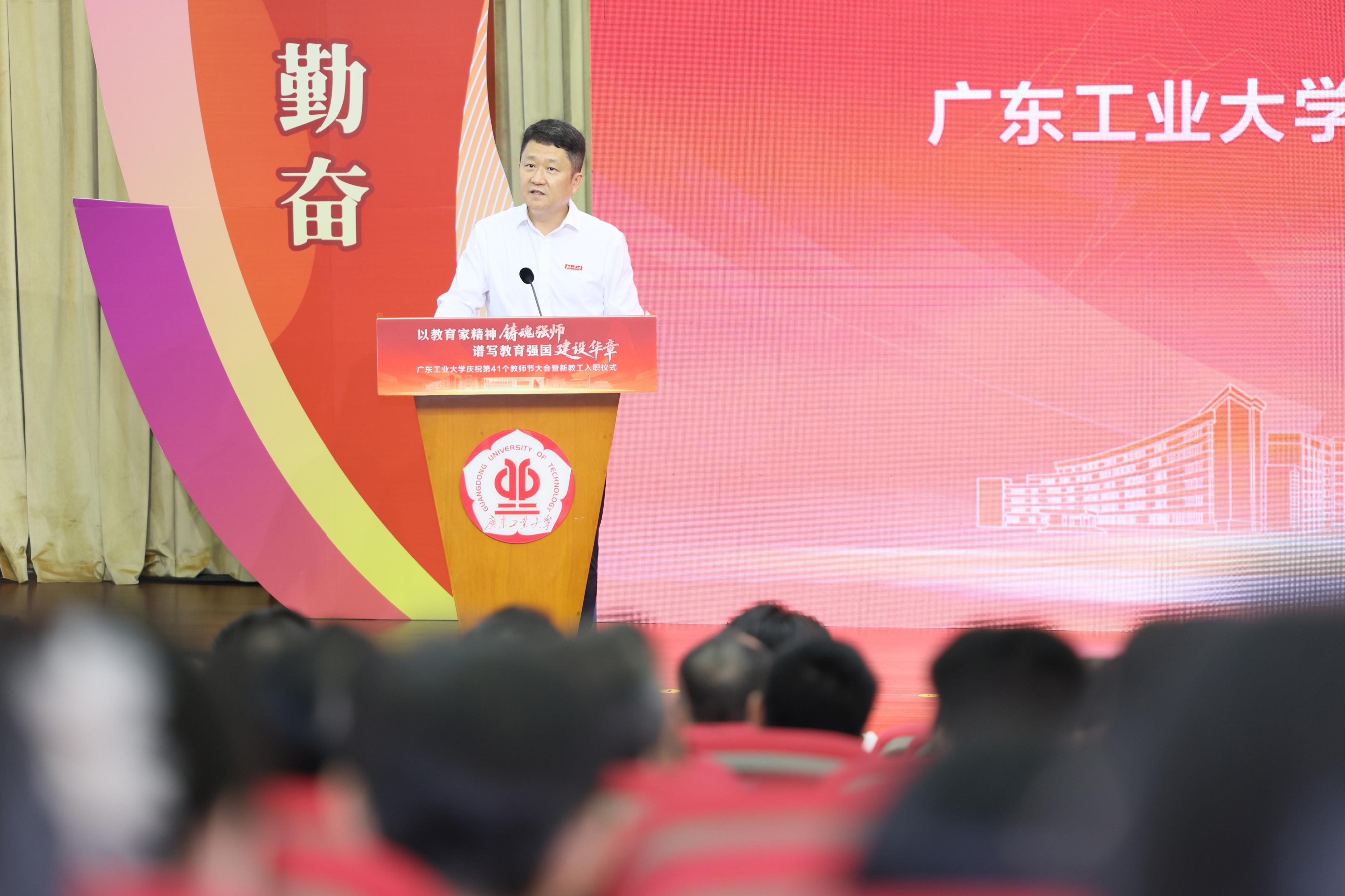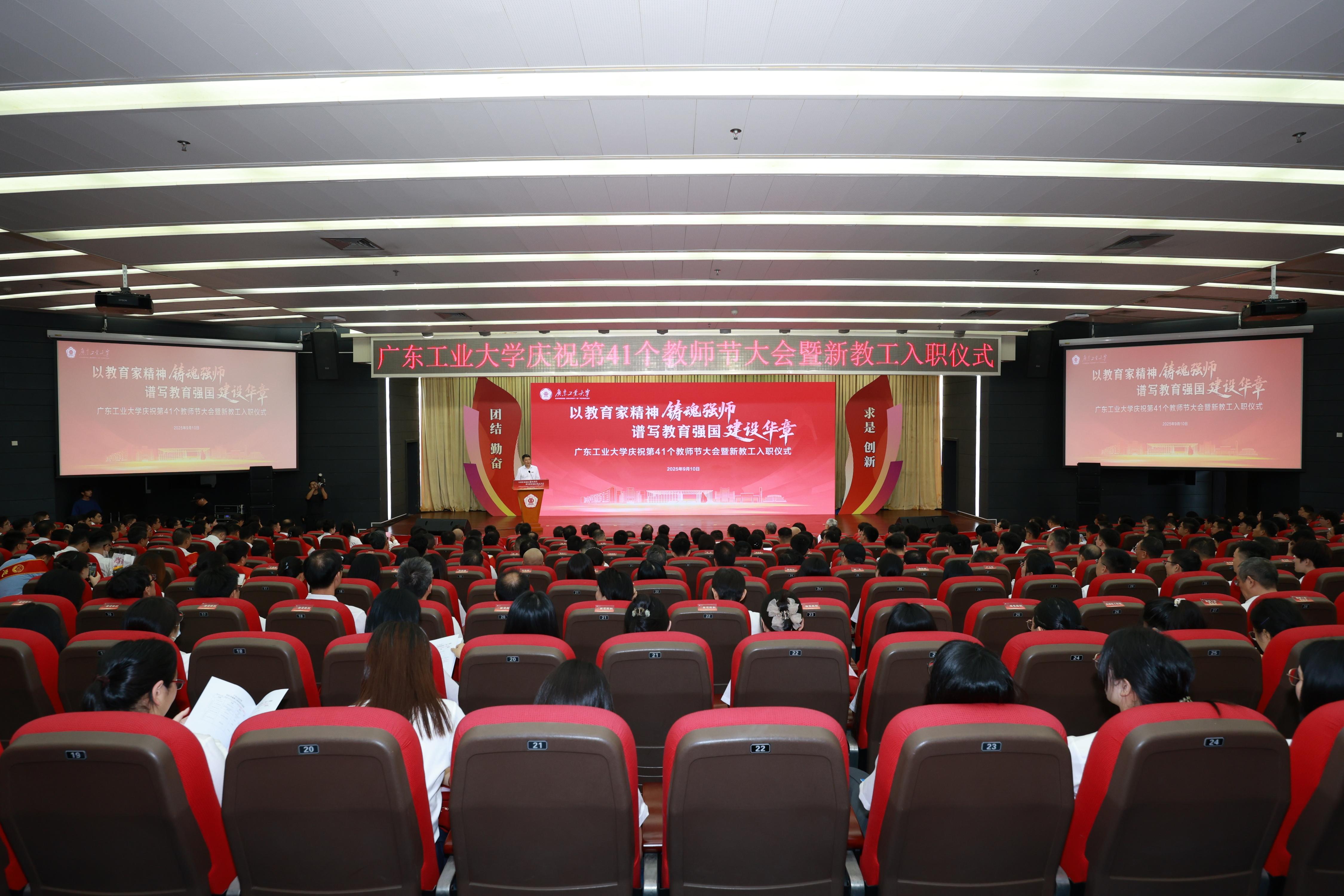 9月10日上午,广工庆祝第41个教师节大会暨2025年新教工入职仪式在大学城校区大讲堂三楼报告厅举行,6位“南粤优秀教师”和205位“忠诚服务奖”教职工荣获表彰,289名新教工庄重宣誓成为人民教师。
