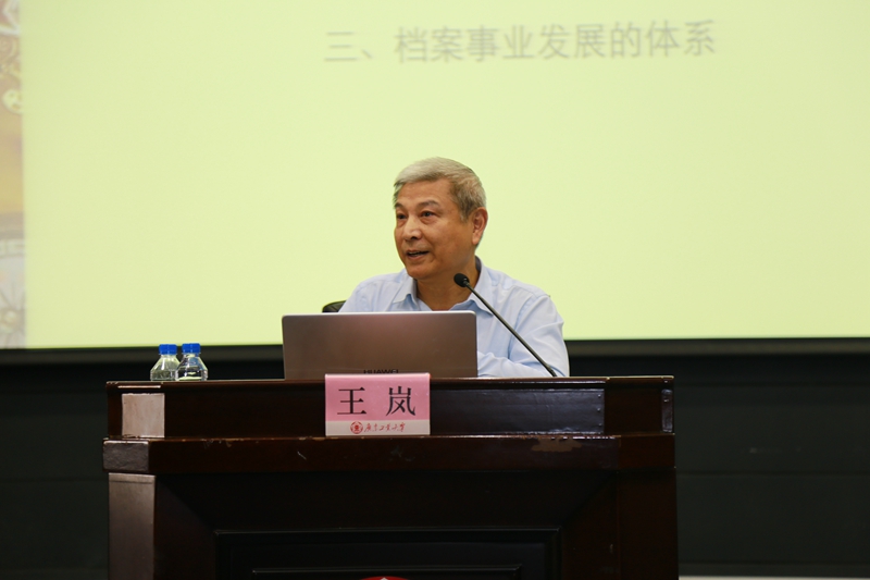 国家档案局政策法规司原司长、研究馆员王岚应邀作题为《新时代档案工作与档案事业发展的法制保障》的专题报告。讲座围绕“档案法修订情况概要、档案行政相对人义务、档案事业发展的体系”等三方面内容展开。王岚首先介绍本次档案法修订的总体情况,指出新《档案法》是对1988年1月1日施行的《档案法》的首次修订,它为新时代档案事业高质量发展提供坚强法制保障。他从新《档案法》修订的背景、过程、内容、意义等方面切入,分十个重点进行详细解读与深入阐释,认为健全有效的档案管理是国家治理、管理不可或缺的重要基础。接着,他深入剖析了档案行政相对人义务和档案事业发展体系,指出档案事业是一项涵盖社会各方面、服务各方面的经久的事业。最后,他指出,学校各级领导干部和全体人员要认真学习领会《档案法》,增强档案意识,提高对档案工作重要性的认识,提升贯彻执行《档案法》的自觉性,依法重视档案的形成、管理和利用,高水平大学建设要有高水平的档案工作,使档案工作在学校高水平大学建设中作出积极贡献。
