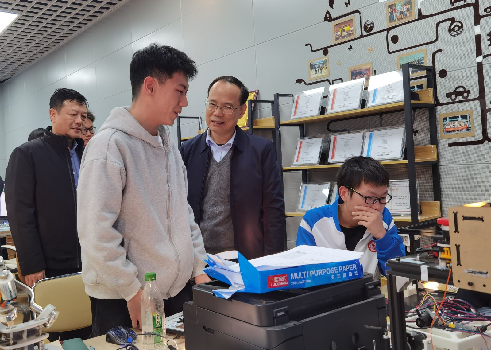 邱学青现场考察了工大创谷的团队工作区、产业学院区、多媒体教室及其他功能区域和办公区域,并与工大创谷内机器人学院、微电子学院假期留校做科研项目、竞赛项目的同学亲切交流。