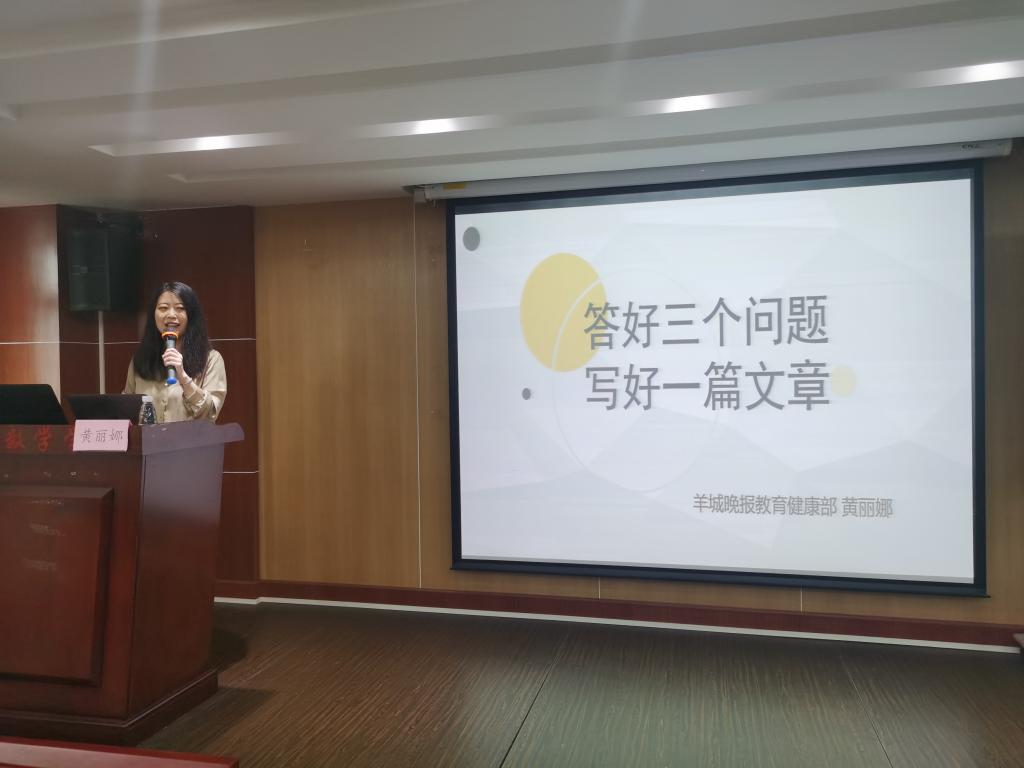 本网讯 3月31日下午,学校通讯员队伍在龙洞校区行政楼610会议室接受了一场新闻写作培训盛宴。羊城晚报教育健康部副主任黄丽娜受邀作专题培训讲座,党委宣传部相关人员作新闻报道规范、新闻摄影分享。会场座无虚席,许多同学搬来椅子在会场的走廊上认真聆听。