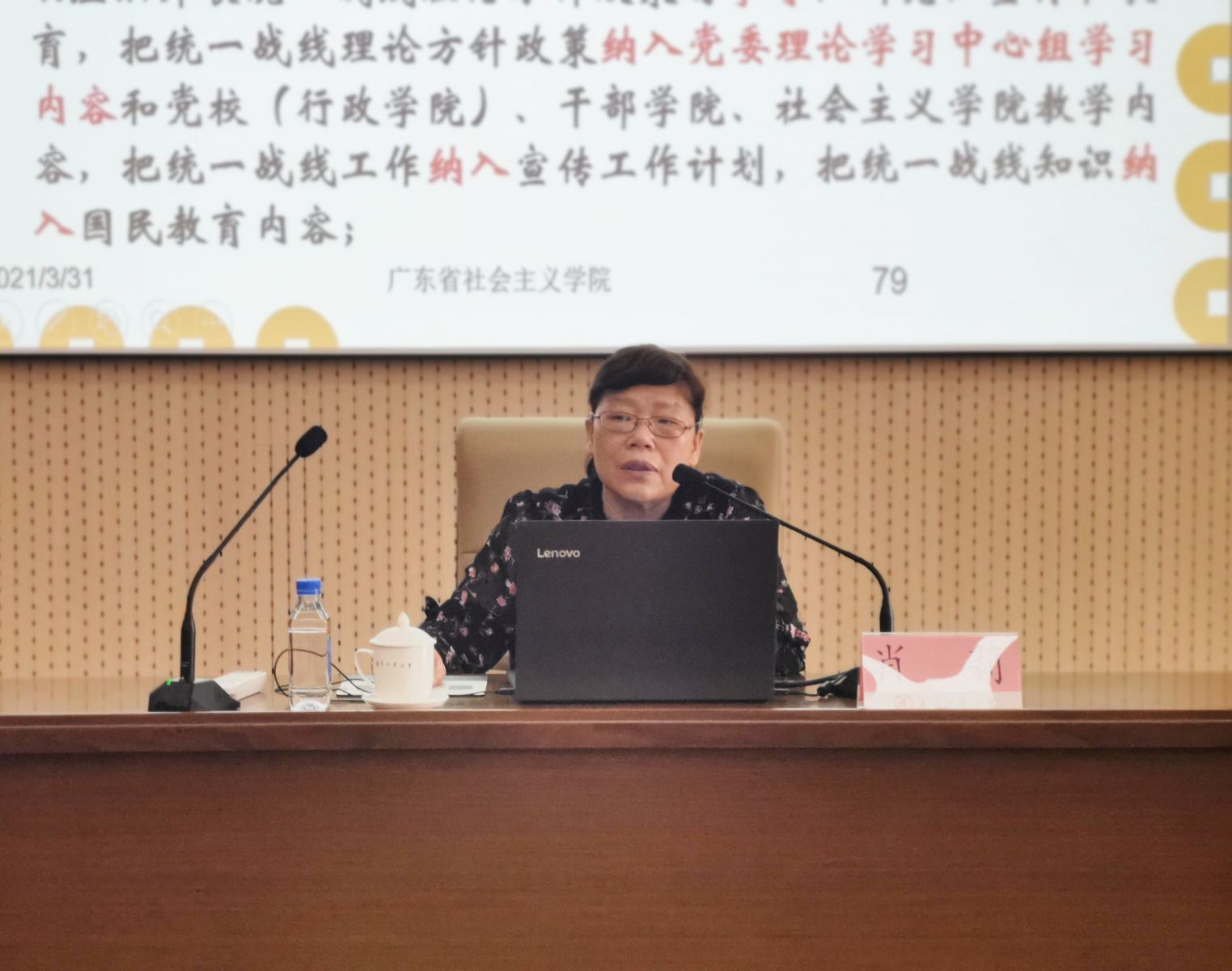 肖莉以《学习贯彻<条例>精神,推进统一战线事业发展》为题,介绍了《条例》修订的背景、意义和主要内容,系统阐述分析了统一战线的基本理论、党对统一战线工作的集中统一领导、统战部门自身建设以及统战工作的保障和监督,并联系高校实际,着重介绍了民主党派和无党派人士工作、党外知识分子工作、民族工作、宗教工作、港澳台统一战线工作、海外统一战线工作、党外代表人士队伍建设等领域的统战工作。