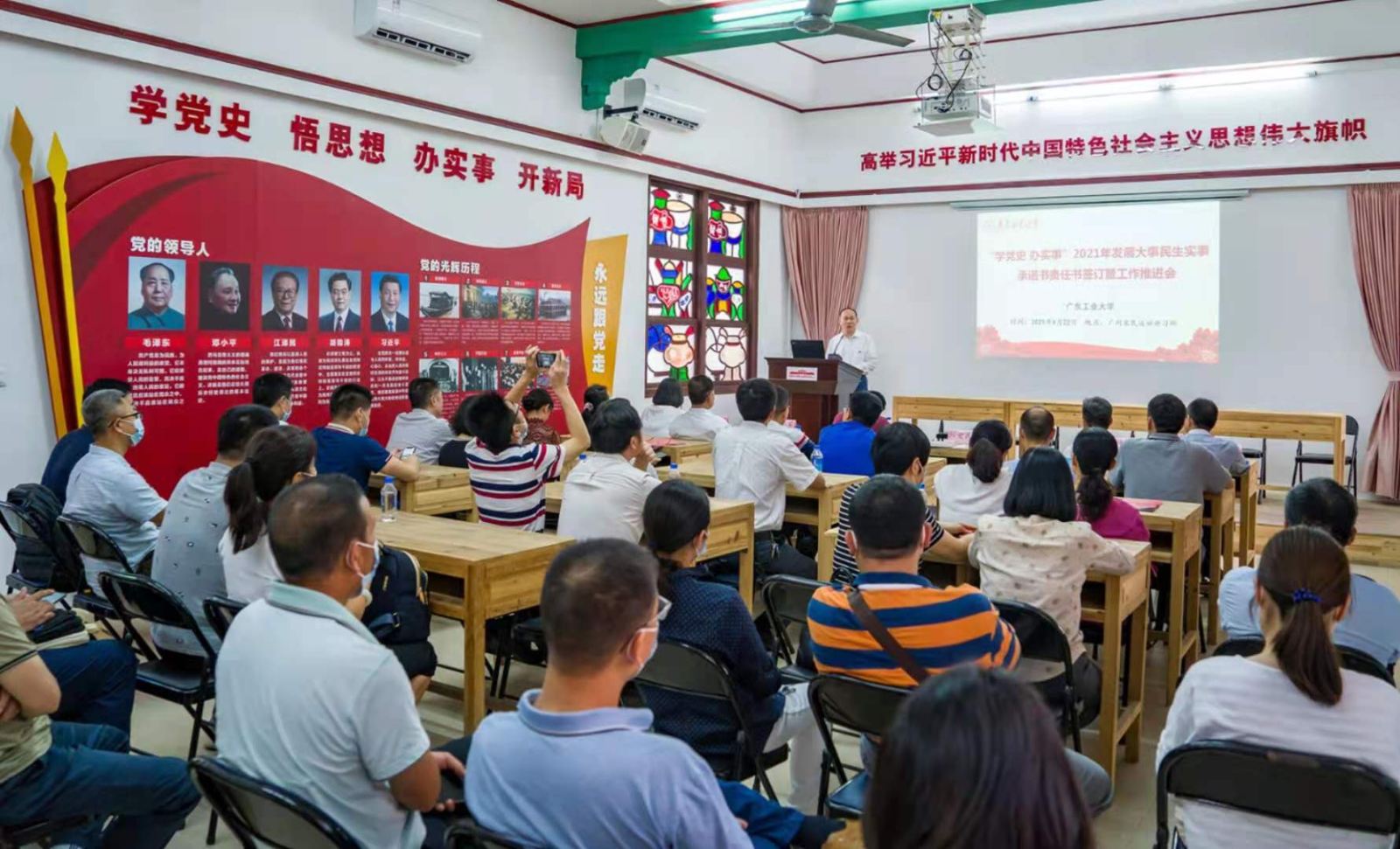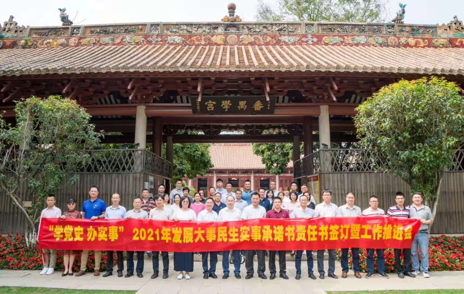 本网讯 4月22日,学校副校长阳爱民及基建处、后勤管理处、网络信息与现代教育技术中心、校医院的党员干部近50人,前往广州农民运动讲习所旧址,举行“学党史 办实事”2021年学校发展大事民生实事承诺书责任书签订暨工作推进会。