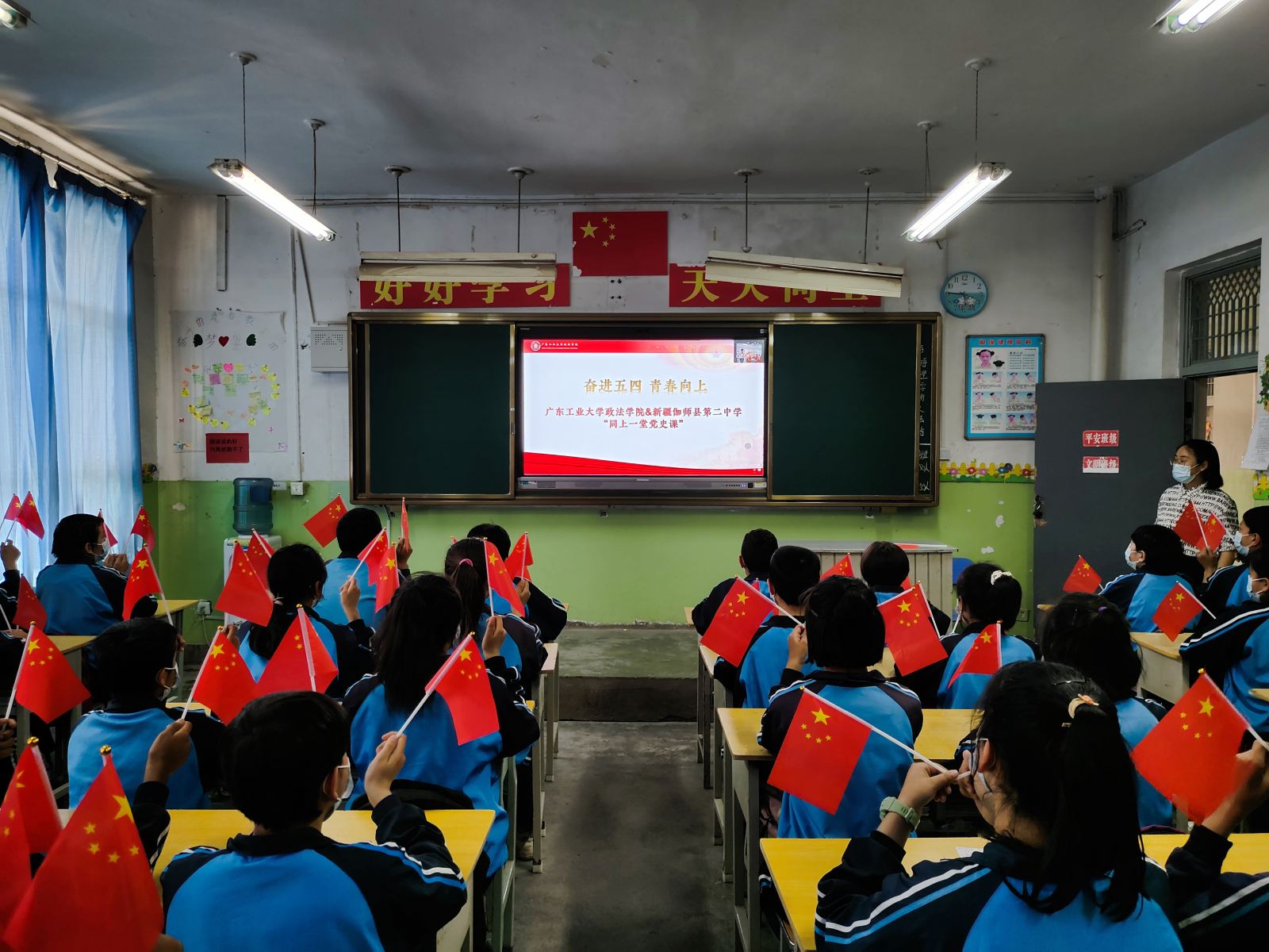 本网讯 为庆祝建党100周年暨纪念五四运动102周年,扎实推进党史学习教育,近日,广工政法学院通过钉钉平台连线新疆伽师县第二中学开展“奋进五四•青春向上:师生同上一堂党史课”活动。政法学院青年学生代表和伽师县二中全校46个班共2196名团员青年以直播课的方式共同聆听了一堂精彩的党史课。