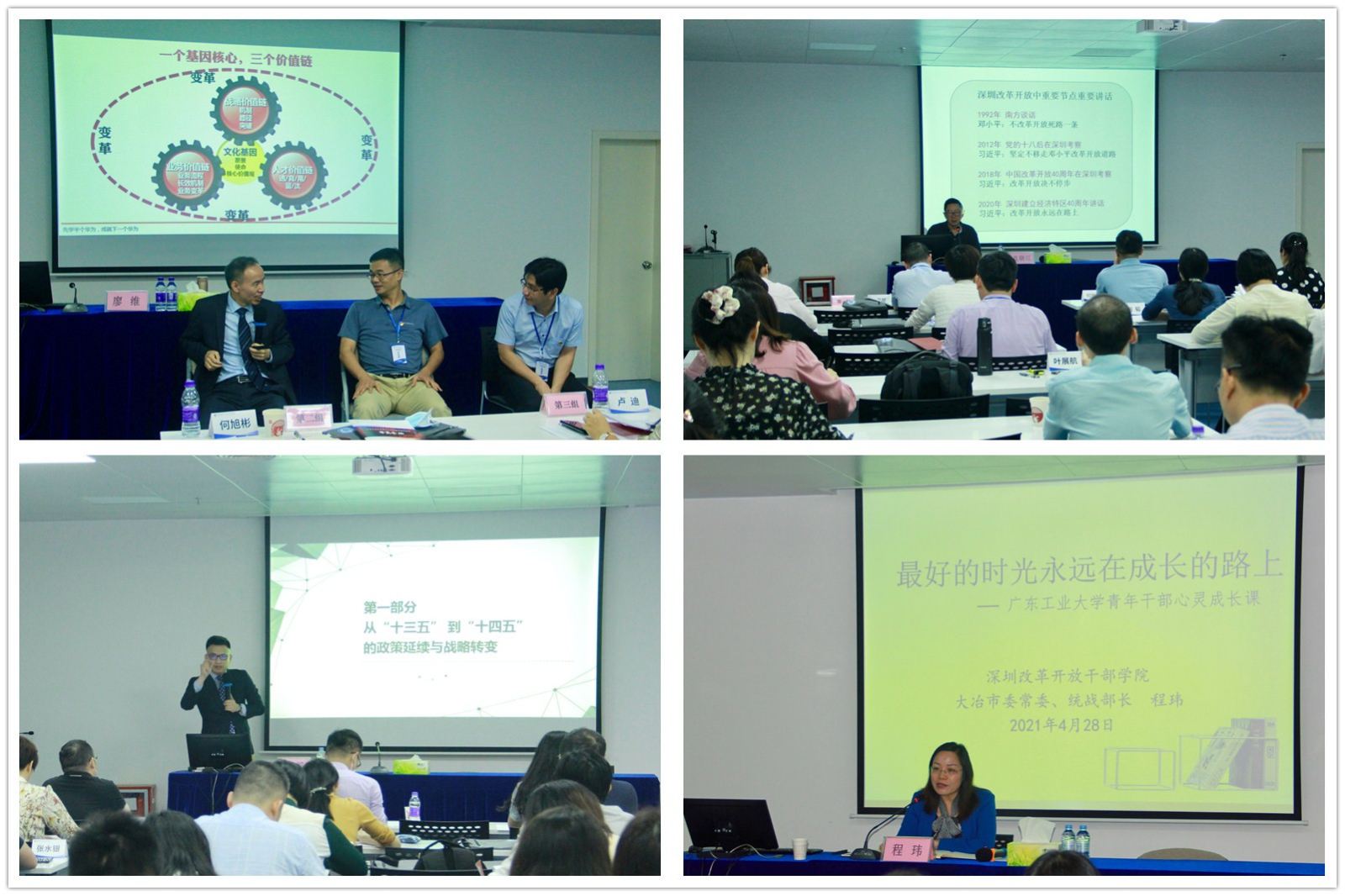 在专题教学中,深圳市委党校原副局级校委委员、教授、博士后导师袁晓江以《改革开放宣言书和动员令——习近平在深圳庆祝大会及视察广东重要讲话》为题,生动阐述了深圳改革开放历程和新时代深圳的鲜明品格;中央社会主义学院统一战线高端智库特约研究员、中美问题和香港问题专家庞滔,以《粤港澳大湾区融合发展与青年担当》为题,讲授了国家从“十三五”到“十四五”的政策延续和战略转变,深入剖析了大湾区的战略意义,青年发展与大湾区建设的关系;大冶市委常委、统战部部长程玮为大家上了一堂干部成长课,从自身经历出发,告诉青年干部要能沉得下去,用心体验成长的过程,要把好方向盘,做自己人生的规划师;华为组织流程与变革管理专家廖维以《在商言熵:华为管理的“道”与“术”》为题,讲授了一堂精彩的案例课,他介绍了华为管理哲学中“熵增”“熵减”的内涵,分享了如何通过“熵减”使组织充满活力。