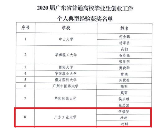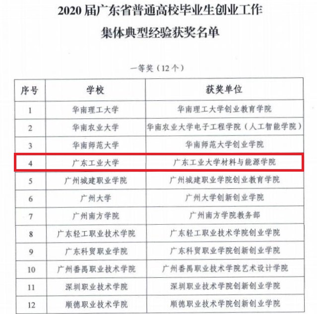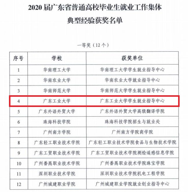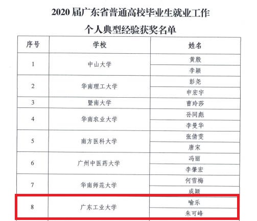 本网讯 近日,广东省教育厅公布了2020届广东省普通高校毕业生就业创业工作典型经验集体和个人获奖名单,线上买球官网(中国)官方网站荣获就业创业工作典型集体经验一等奖2项,个人典型经验奖5项,其中学生就业指导中心获“就业工作典型集体经验一等奖”,材料与能源学院获“创业工作典型集体经验一等奖”,喻乐、朱可峰获“就业工作个人典型经验奖”,李镇贤、杜坤、柯婷获“创业工作个人典型经验奖”。具体表彰名单如下: