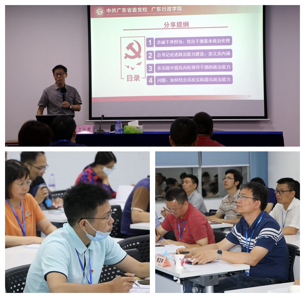 在专题教学中,广东省委党校社科部、广东行政学院政治部教授文小勇以《加强新时代领导干部的政治能力建设》为题,阐释了习近平总书记关于党的政治建设和干部政治能力的重要论述,并借助正反两方面案例,深刻剖析了以忠诚、干净、担当为核心的党员干部基本政治伦理。深圳市委宣传部理论处干部张然在《学习贯彻习近平总书记系列重要讲话精神,坚决守好意识形态安全“南大门”》中,用现实案例讲述了当前国际形势的复杂性,以及党员干部增强底线思维和斗争本领的重要意义。《粤港澳大湾区融合发展与广州发展机遇》由中央社会主义学院统一战线高端智库特约研究员、广州社会主义学院副教授庞滔主讲,深入分析了“两新一高”“双循环”背景下粤港澳融合发展、广州高质量发展的机遇、挑战以及创新实践的路径,为领导干部带来了宏观视野。南方科技大学党委副书记、纪委书记李凤亮以南方科技大学为例,生动讲述了一流城市与一流大学的关系,以及现代大学治理体系与治理能力建设的实践探索。拥有13年华为工作经历的张阳老师,分享了华为以客户为中心、以奋斗者为本、长期艰苦奋斗、坚持自我批判的企业文化和制度机制,揭示了华为高效执行力的“密码”。