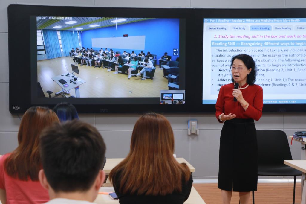 如今,教师在智慧教室里为同学们授课,凭借5G实现的4K影像实时传输以及多屏实时互动的技术,不同校区的学生也可参与到课堂中,并通过手机实时观看高清直播的内容。智慧教室内配备的360度全景摄像头,将课堂上的精彩内容同步上传至“蕴瑜融合学习空间”,学生可在线随时观看课堂内容。