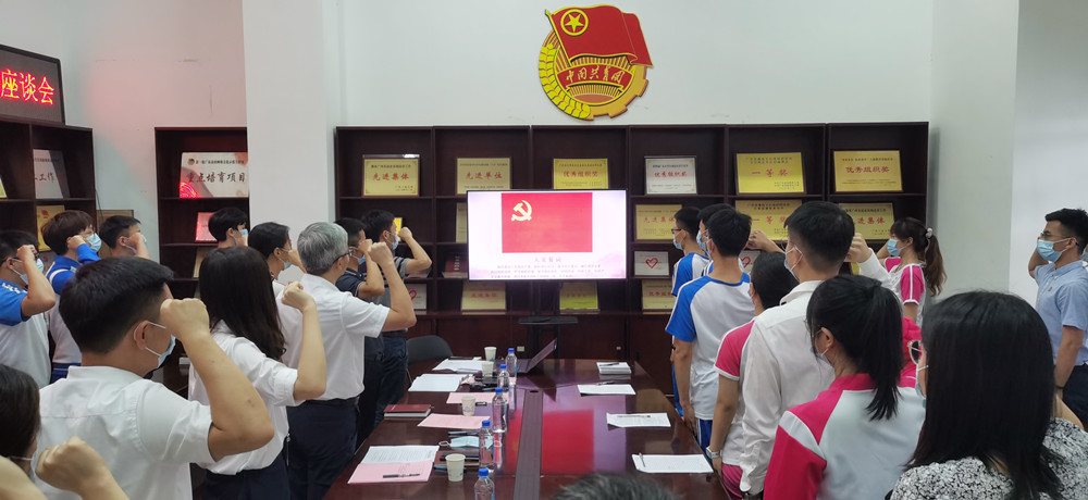“我志愿加入中国共产党……”在陈卓武的带领下,与会师生党员面向鲜艳的党旗庄严宣誓,重温入党誓词。