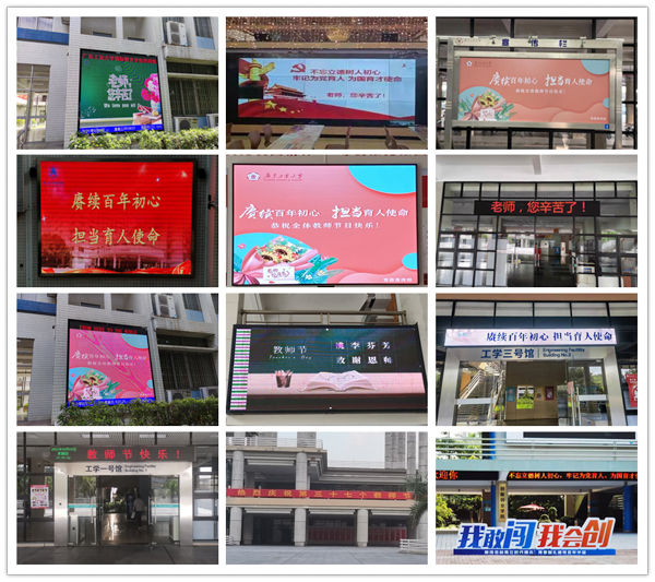 在教师节当天,学校同时开展了“为教师亮灯”活动,在各校区办公楼、教学楼、实验楼等场所电子显示屏为教师“亮灯”,为广大教师送去节日的祝福!