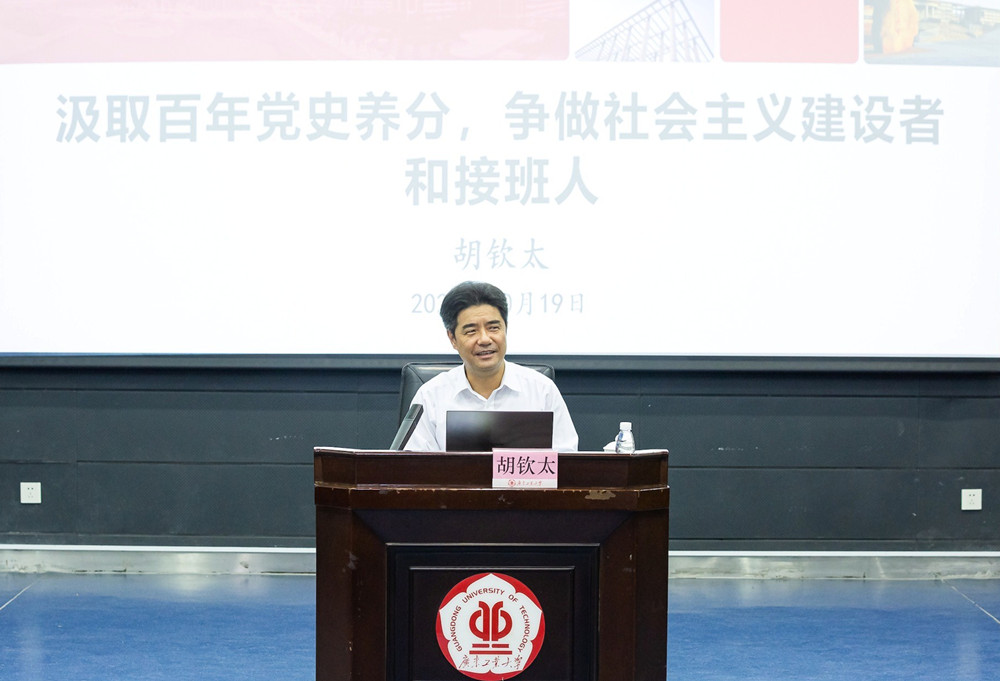 胡钦太以“汲取百年党史养分,争做社会主义建设者和接班人”为题讲授“青马第一课”。他以百年党史的四个历史阶段为线索,带领学员系统回顾梳理了中国共产党跌宕起伏的风雨历程和辉煌成就,用丰富的史料和生动的案例呈现了中国共产党领导下的中华民族奋斗过程和共和国发展历程。他还勉励学员,要学习共产党人为民奋斗的初心,坚持以人民为中心;要把握当下,发扬斗争精神,凝聚敢于斗争的勇气,在全面建设社会主义现代化国家的新征程中,厚植奋力前进的自信;要放眼看世界,主动应变、求变,融入时代,在变化中不断提升自己;要坚定中国视角,牢记党的初心和使命,牢记党的性质和宗旨,传承和弘扬中华优秀传统文化;要认识自己的角色定位,坚持知行合一。