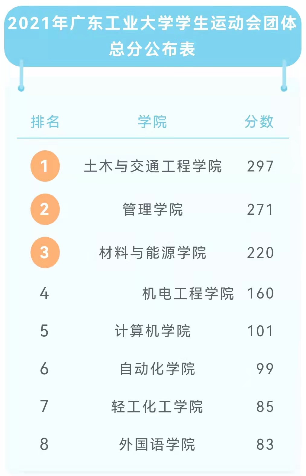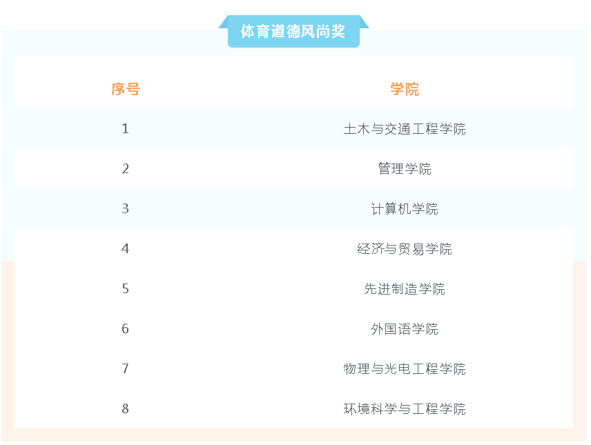 经过激烈角逐,团体总分前8名由土木与交通工程学院等8个参赛单位获得,“体育道德风尚奖”由土木与交通工程学院、管理学院等8个参赛单位获得,优秀组织奖由先进制造学院获得。