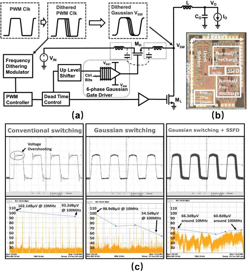基于高斯开关的控制方法的氮化镓栅极驱动芯片:(a)系统架构;(b)芯片照片;(c)不同工作模式测试结果