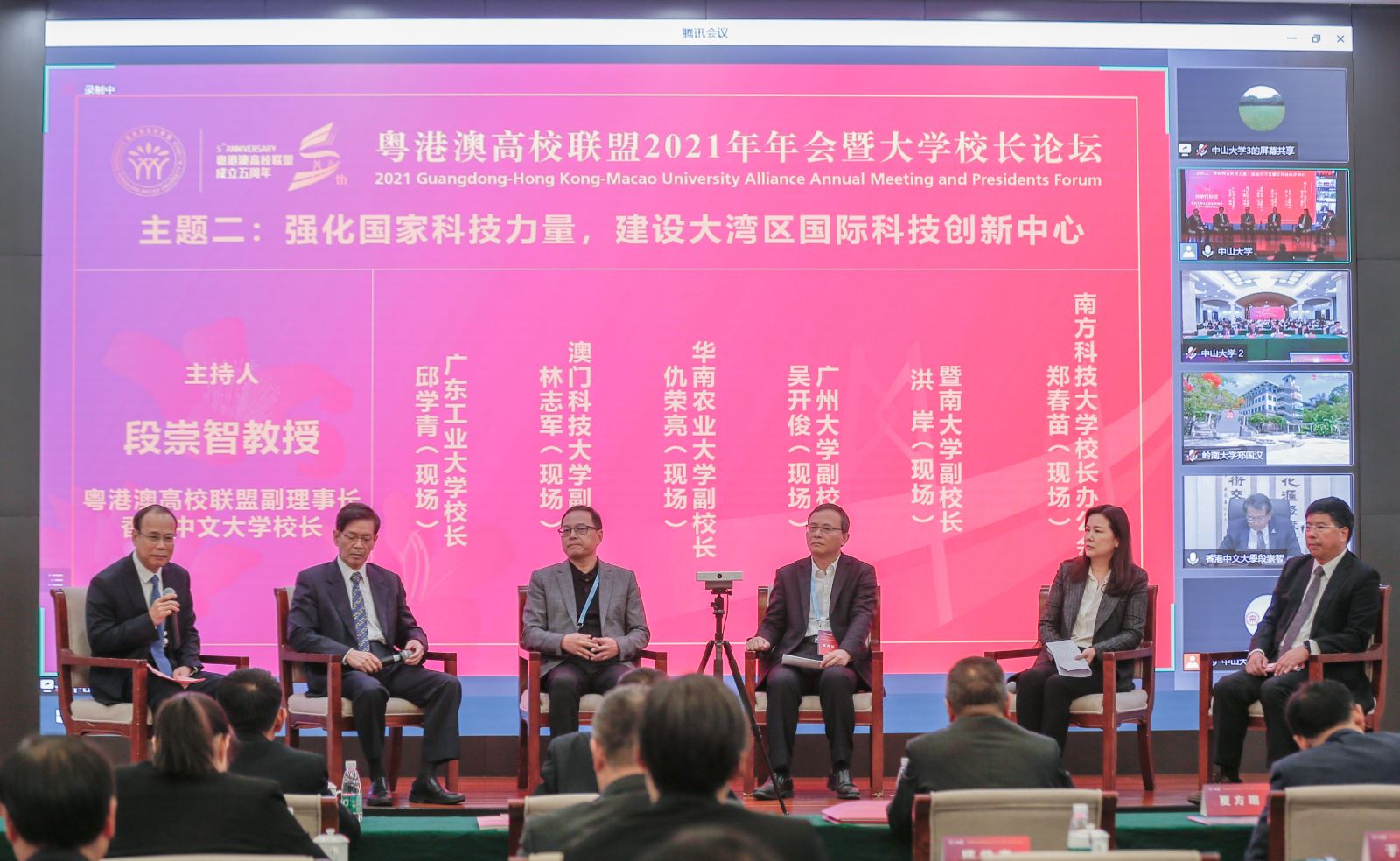 粤港澳高校联盟 2021 年年会暨大学校长论坛于11 月 22 日在中山大学广州校区南校园怀士堂举行。来自教育部、省教育厅、省港澳办、省科技厅、香港特别行政区政府教育局、澳门特别行政区政府教育及青年发展局、香港中联办等政府部门代表以及联盟成员校长代表通过线上线下齐聚一堂,共襄盛会。校长邱学青应邀出席现场活动。