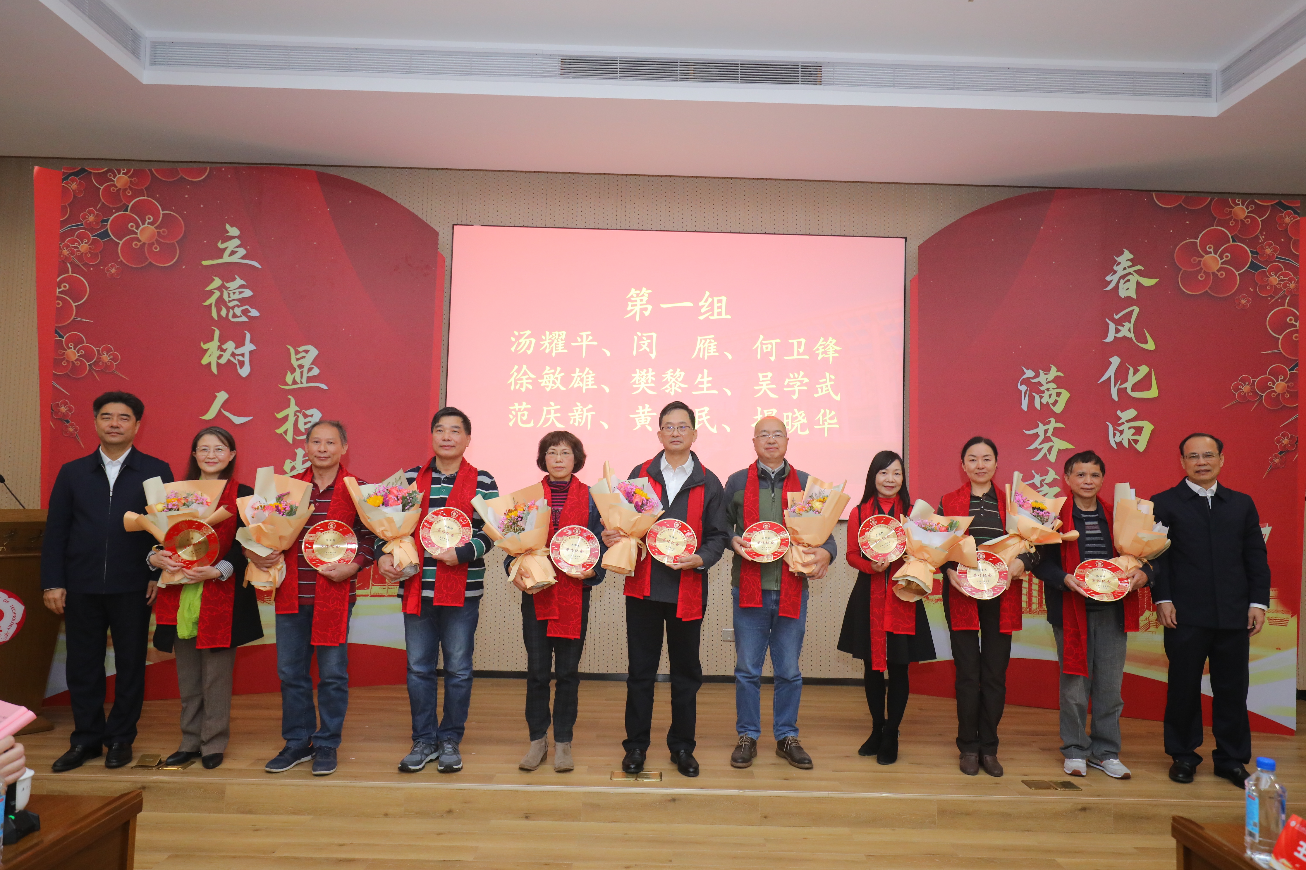 仪式上,胡钦太、邱学青与退休教职工一一亲切握手,为他们亲手围上温暖的红围巾并颁发荣休纪念牌,学生代表为老师们敬献鲜花。随后,与会人员集体合影。