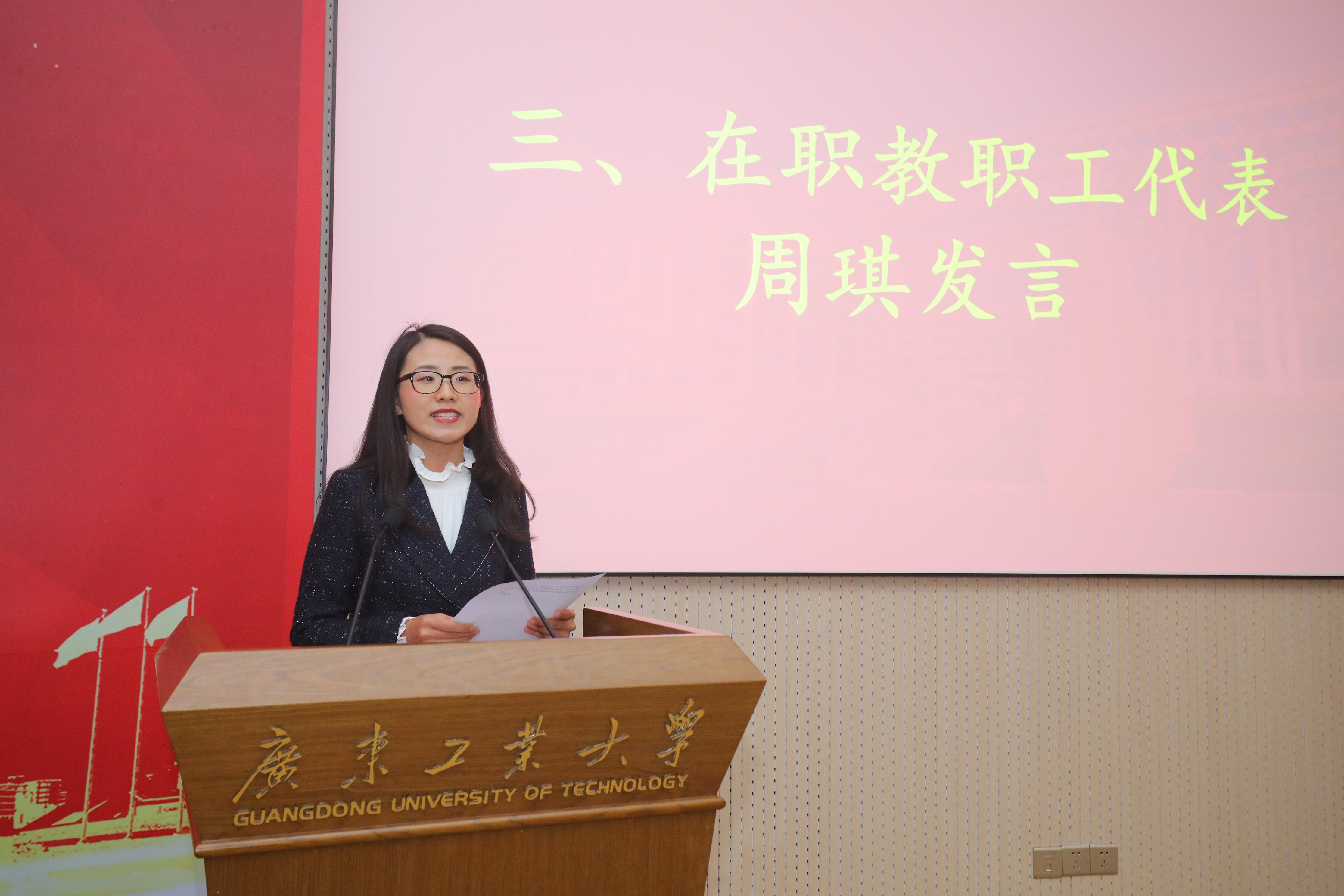 自动化学院青年教师周琪作为在职教职工代表发言,感谢数十年来兢兢业业工作的前辈们把青春时光奉献给了教育事业,把经验传承给了青年教师,把精神力量传递给了莘莘学子。周琪代表全校青年教师,向全体荣休教师表示一定不负前辈的厚望,接力前行,不忘“为国植贤”初心,牢记“立德树人”使命,继续为学校的建设和发展贡献力量。