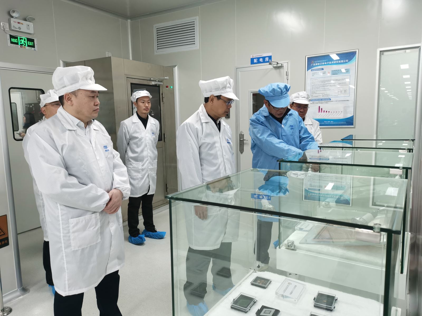 邱学青一行先后参观了研究院成果展厅、广东阿达智能装备有限公司生产车间、广东省智能装备和系统集成创新中心板级扇出封装示范线,以及广东国防科技工业技术成果产业化应用推广中心,深入了解研究院及园区企业、国防中心在技术研发、人才引进、成果转化、产业培育等领域建设情况。