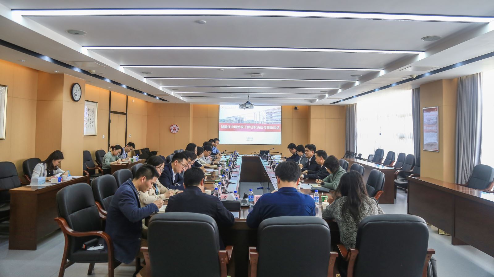 3月3日上午,学校新提任中层干部任职谈话与廉政谈话会议在大学城校区行政楼702会议室举行。学校党委书记胡钦太,党委副书记陈良友,党委副书记、纪委书记、广东省监委驻线上买球官网(中国)官方网站监察专员熊静与新提任的15名中层干部进行了集体谈话。会议由党委常委,组织部、统战部部长李靖茂主持。