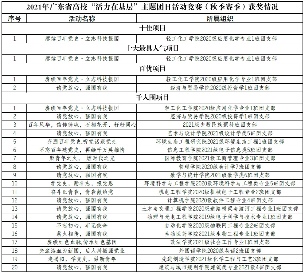 近日,团省委公布2021年广东省高校“活力在基层”主题团日竞赛活动秋季赛季获奖项目名单。我校轻工化工学院2020级应用化学专业1班团支部“赓续百年党史·立志科技报国”主题团日活动获评为广东省“十佳项目”“十大最具人气项目”,也是全省唯一同时获得此两项奖项的团支部,另有2个团支部主题团日活动获评“百优项目”,20个团支部主题团日活动获评“千入围项目”。