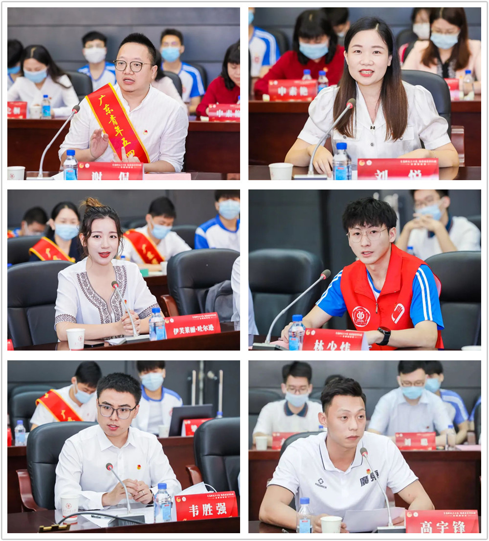 六位师生代表结合自身经历,与大家分享了彰显青春魅力的奋斗事迹与追梦故事:广东青年五四奖章(提名奖)获得者、自动化学院青年教师谢侃表示,在学校高水平大学建设中,青年教师要严爱相济、润己泽人,以人格魅力呵护学生心灵,以学术造诣开启学生智慧;广东省优秀共青团干部、建筑与城市规划学院团委书记刘悦表示,共青团干部要在青春的赛道上做到“大”与“小”的辩证统一,才能做好共青团各项工作;外国语学院本科生伊芙莱丽·吐尔逊说:“广工就是自己的第二个家,在这个家里收获了成长,日常生活快乐且充实,希望学校能越来越好。”广东省向上向善好青年、环境科学与工程学院本科生林少炜说:“求学的目的不是脱离贫困的家乡,而是为了家乡脱离贫困。”“挑战杯”竞赛团队负责人、机电工程学院硕士研究生韦胜强说:“甘愿为中国电子制造的发展贡献自己的青春,哪怕是成为不起眼的垫脚石。”学校乙组男子篮球队队长、CUBA全明星球员、经济与贸易学院本科生高宇锋认为“人生正如训练,不管前路多艰辛,只要流尽汗水,用尽力气,总有一天能达到自己想要的结果。”