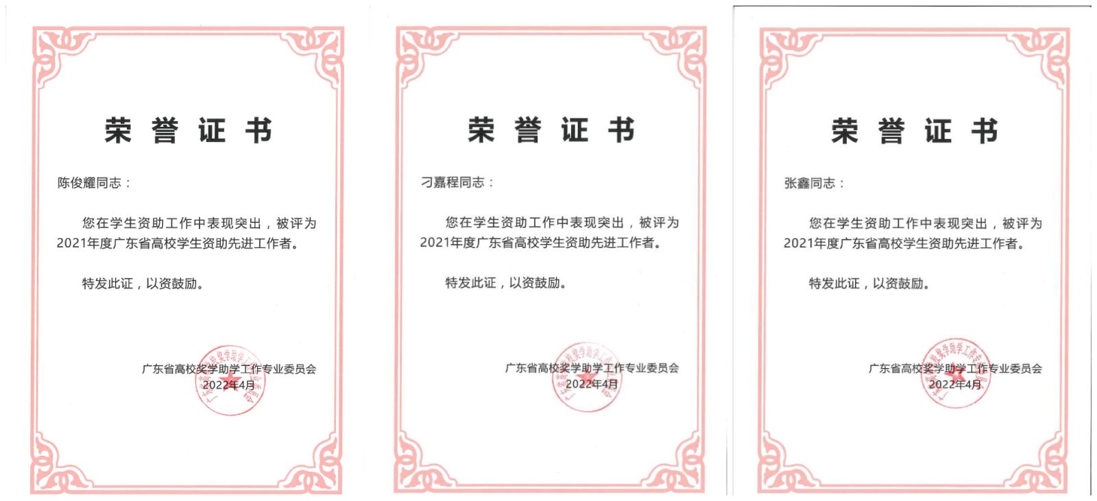 近日,广东省普通高校奖助学工作专业委员会发布《关于表彰2021年度广东省高校学生资助先进工作者的通知》,广工陈俊耀、刁嘉程、张鑫等3位老师荣获“2021年度广东省高校学生资助先进工作者”称号。