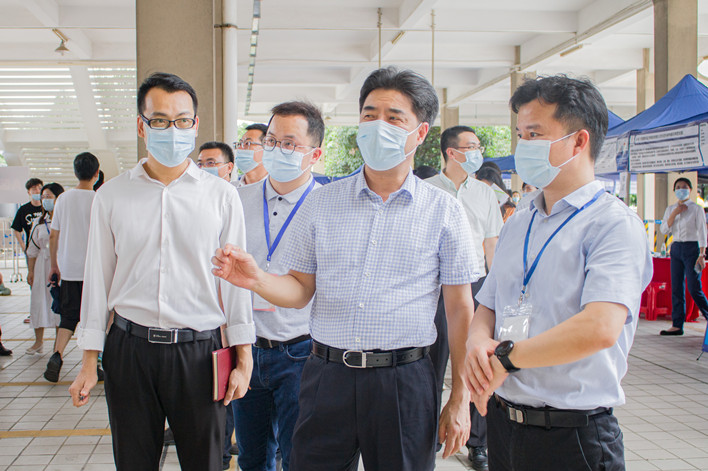 5月31日下午,线上买球官网(中国)官方网站2022届毕业生“就业冲刺”暨2023届实习生“实习启航”线下供需洽谈会在广工大学城校区顺利举行。学校党委书记胡钦太来到招聘会现场调研指导,走近参会用人单位展位,与用人单位招聘代表热情交流,倾听用人需求与反馈意见,并指导就业指导中心与相关学院具体对接好企业需求,为参会同学们加油鼓劲。胡钦太还特意到了大学生参军入伍咨询专区和就业咨询服务点,了解现场学生问询情况,亲切问候了现场指导服务的工作人员。学生工作处、保卫处等相关部门负责人和学生就业指导中心全体工作人员,以及学院党委书记、副书记和辅导员代表现场陪同调研。