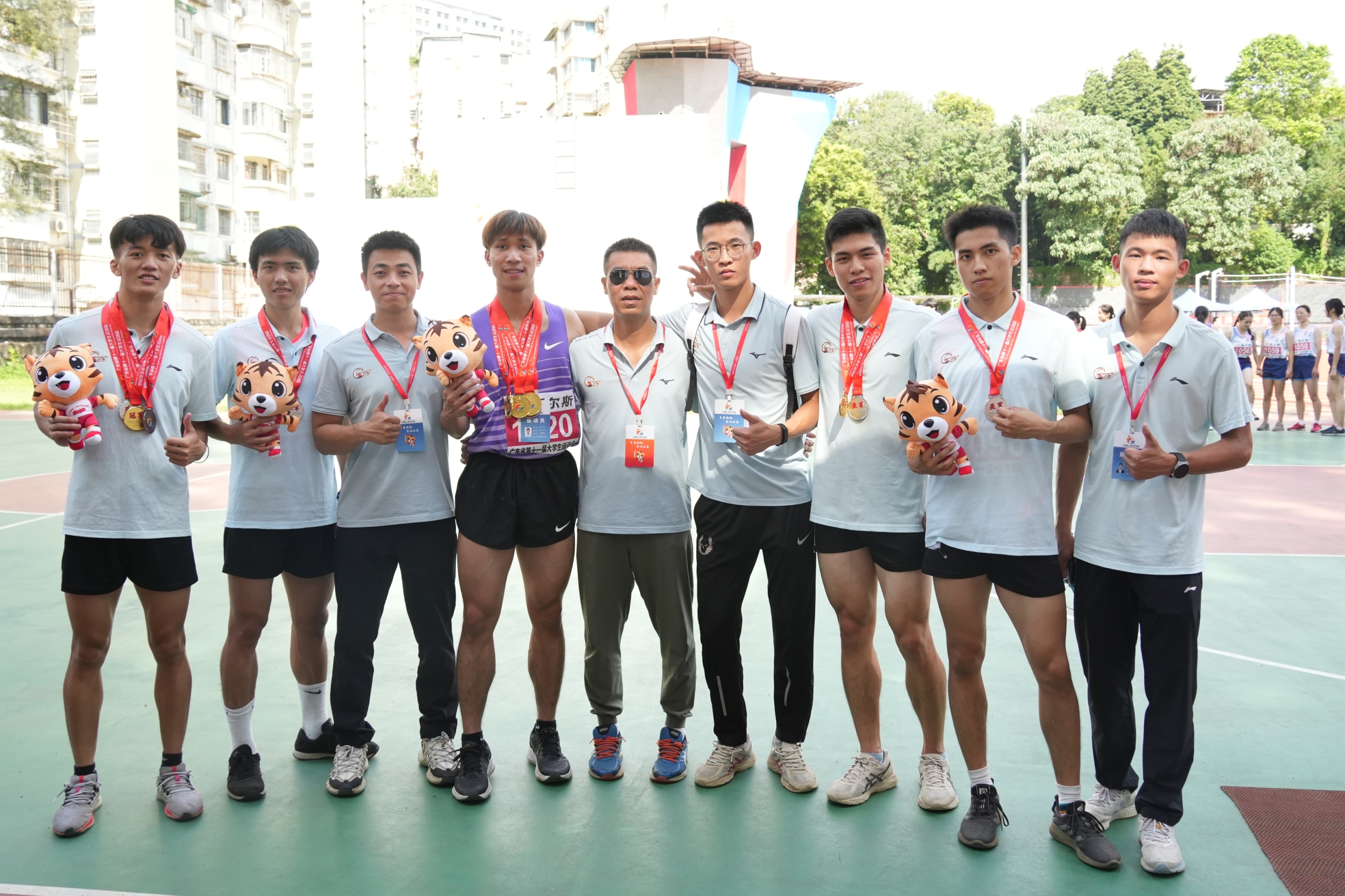 接力比赛是田径项目中唯一的集体项目。该项目考验全员的个人能力、团队协作能力、交接棒技术和教练排兵布阵的水平。广工丘煜、史少聪、张泽辉、罗胤龙同学在4×100米接力赛中以预赛综合成绩第一杀入决赛并在决赛中一骑绝尘,勇夺金牌!仅仅一天之后,余锦涛、张泽辉、史少聪、梁郁昊、罗胤龙五位同学在4×400米接力中完美执行教练赛前布置的战术,以预赛综合成绩第三进入决赛,并在决赛中顽强拼搏,绝地反击,勇夺亚军!