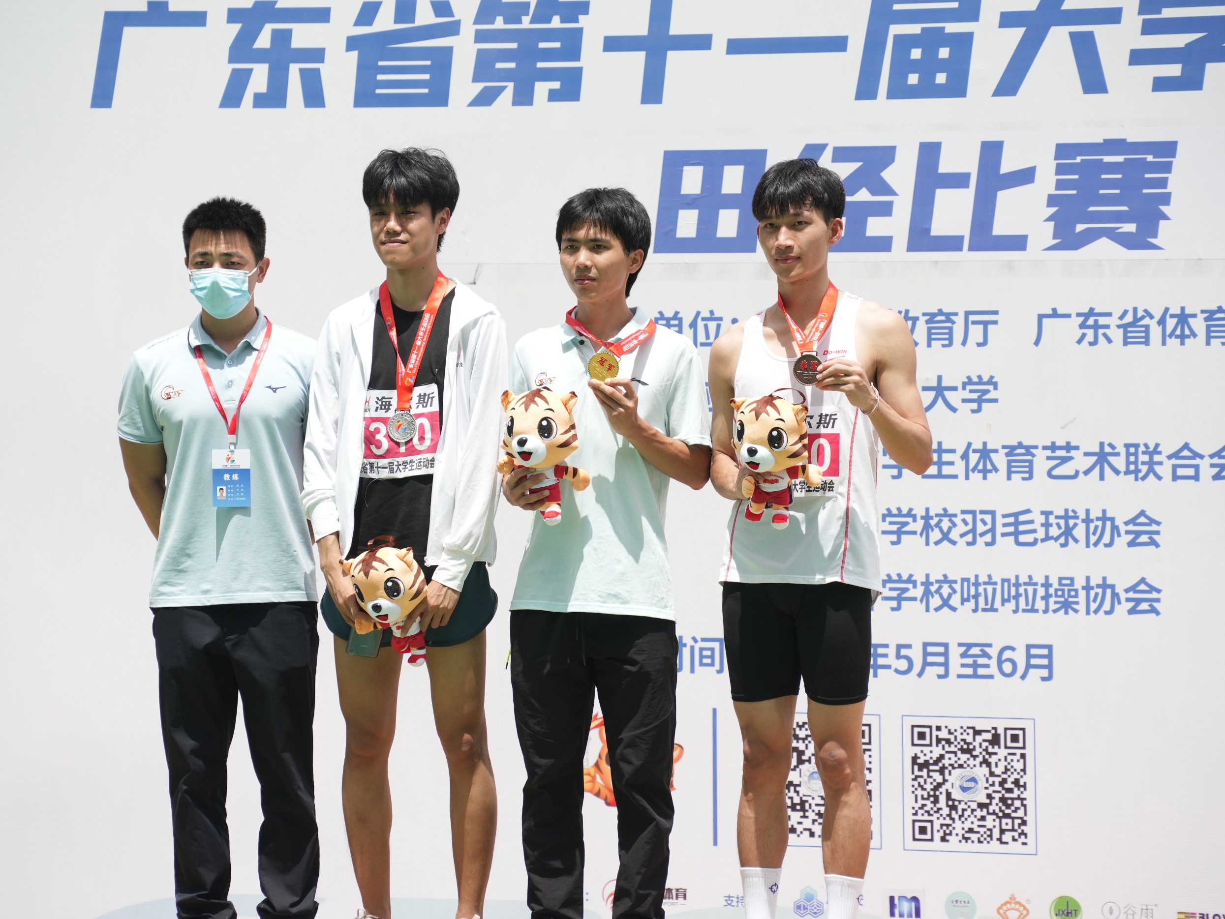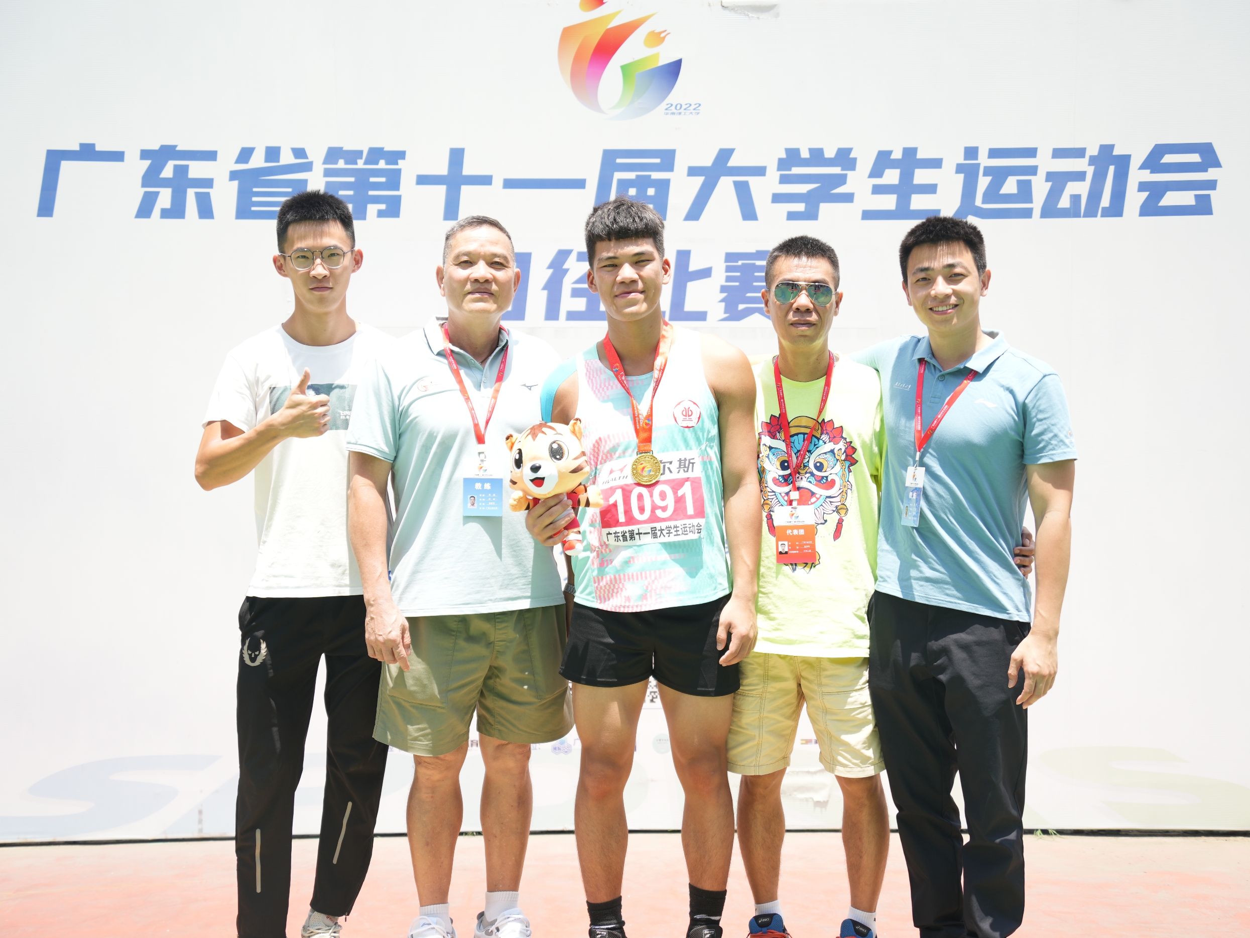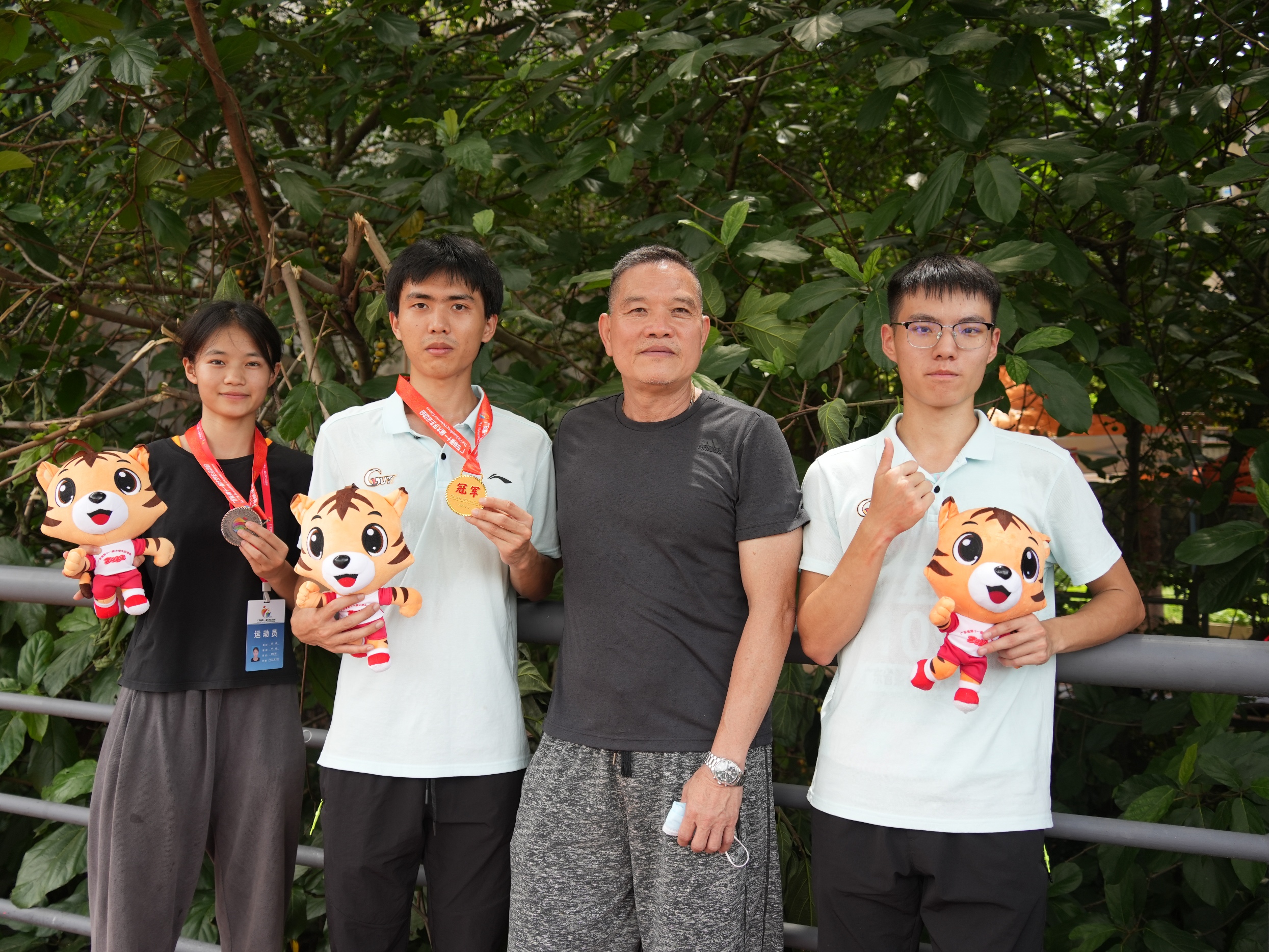 男子跳远冠军张泽辉(右二)与教练余健(左一)
