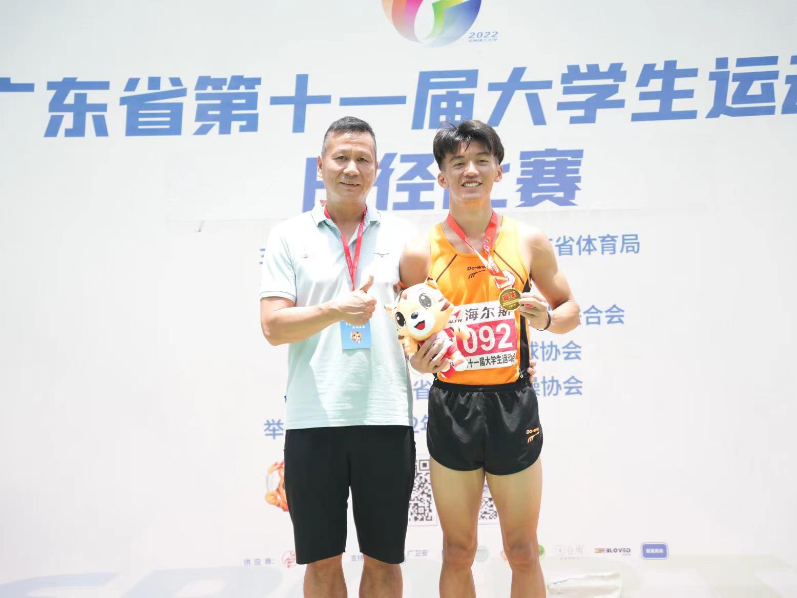 男子400米栏冠军梁郁昊(右)与教练李文聪(左)