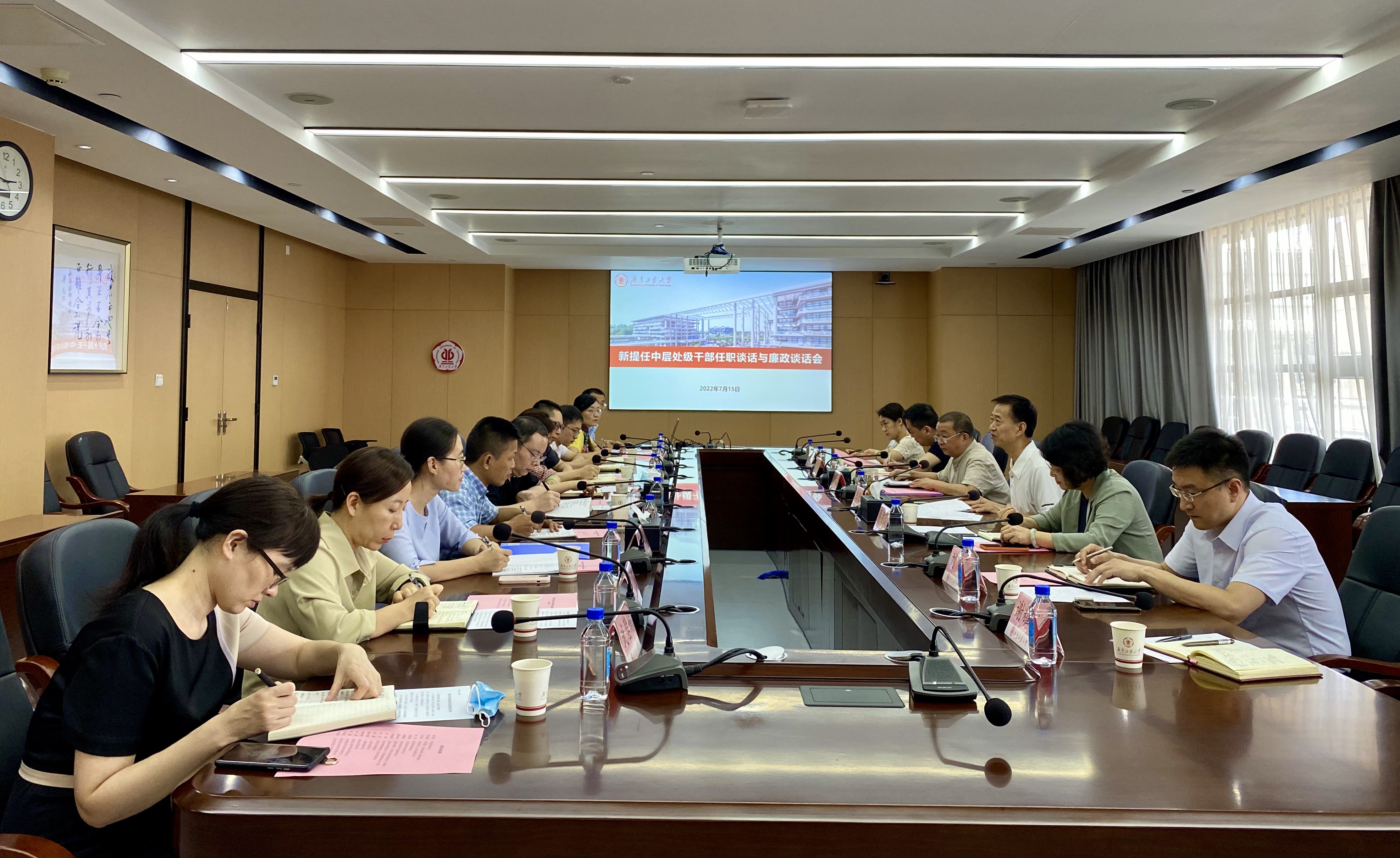 7月15日下午,学校新提任中层干部任职谈话与廉政谈话会议在大学城校区行政楼702会议室举行。学校党委副书记陈良友,纪委、纪检监察室主要负责人与新提任的10名中层干部进行了集体谈话。会议由党委常委,组织部、统战部部长李靖茂主持。