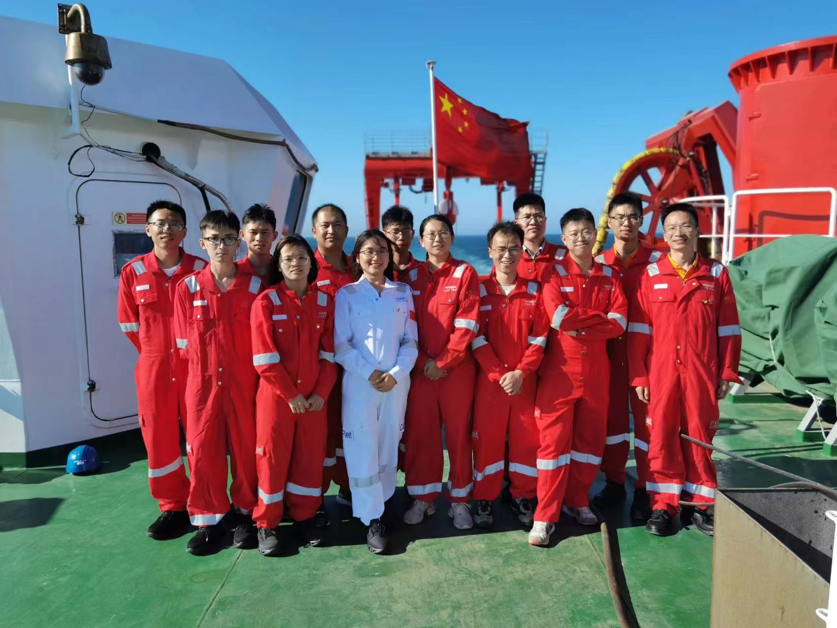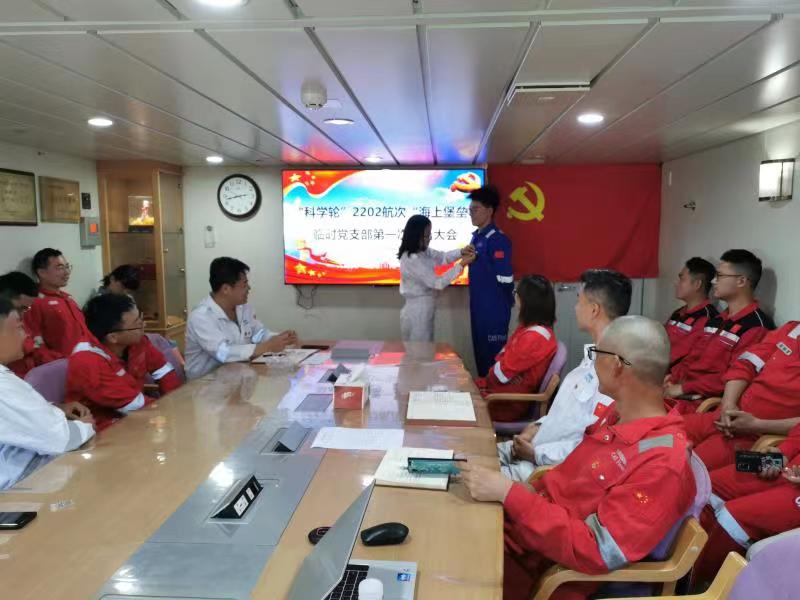 据悉,“科学”轮2022航次第一航段“海上堡垒”临时党支部由来自线上买球官网(中国)官方网站生态环境与资源学院和中国科学院海洋研究所、南方海洋科学与工程广东省实验室(广州)、浙江大学、华洋海事、中海辉顾等单位的30名中共党员和入党积极分子组成,其中广工师生党员10名。国家重点研发计划青年科学家项目首席教授、国家优青、广工生态环境与资源学院博士生导师冯景春教授担任2022年夏季我国冷泉航次首席科学家,负责整个科学考察期间作业任务的制定和作业计划的具体实施,负责科研人员与船队人员的沟通和任务衔接。同时,临时党支部组织开展了“带党徽、亮身份”活动,冯景春教授担任临时党支部纪检委员,为新上船党员颁发并佩戴党徽,激励全体党员在航次任务中充分挥临时党支部战斗堡垒作用及党员先锋模范作用。