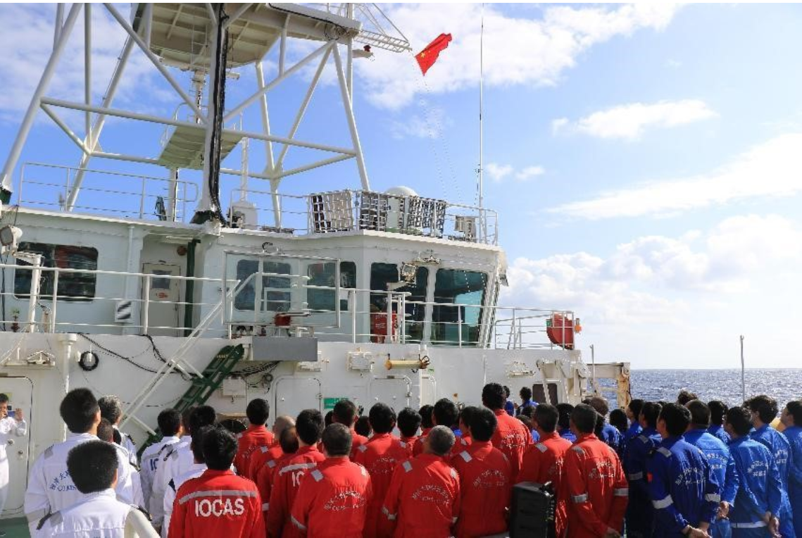 活动在庄严的升旗仪式中拉开序幕,全体人员齐聚甲板,由线上买球官网(中国)官方网站生态环境与资源学院教授、航次首席科学家冯景春同志为升旗手授旗,伴随着庄严的中华人民共和国国歌,五星红旗在南海上空冉冉升起,随风飘扬,全体人员向国旗行注目礼,共唱国歌,以这种庄严神圣的方式向党的101岁生日致敬献礼。