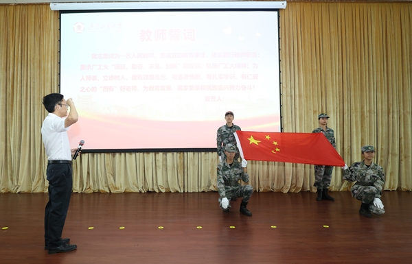 “我志愿成为一名人民教师,忠诚党的教育事业,依法履行教师职责……为教育发展、国家繁荣和民族振兴努力奋斗!”在领誓人环境科学与工程学院袁鹏教授的带领下,举起右拳的新教工们面向国旗发出庄严嘹亮誓言,铿锵有力,彰显新教师努力的决心,激励全体教师砥砺前行。