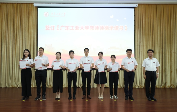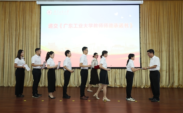“教师是人类灵魂的工程师,是人类文明的传承者……我郑重承诺……”会上,全体新教工严肃郑重签订《线上买球官网(中国)官方网站教师师德承诺书》,来自不同校区各个岗位的新教工代表向胡钦太递交师德承诺书,将师德承诺印入心间,付诸行动,努力成为广工一名优秀的“四有”好老师。