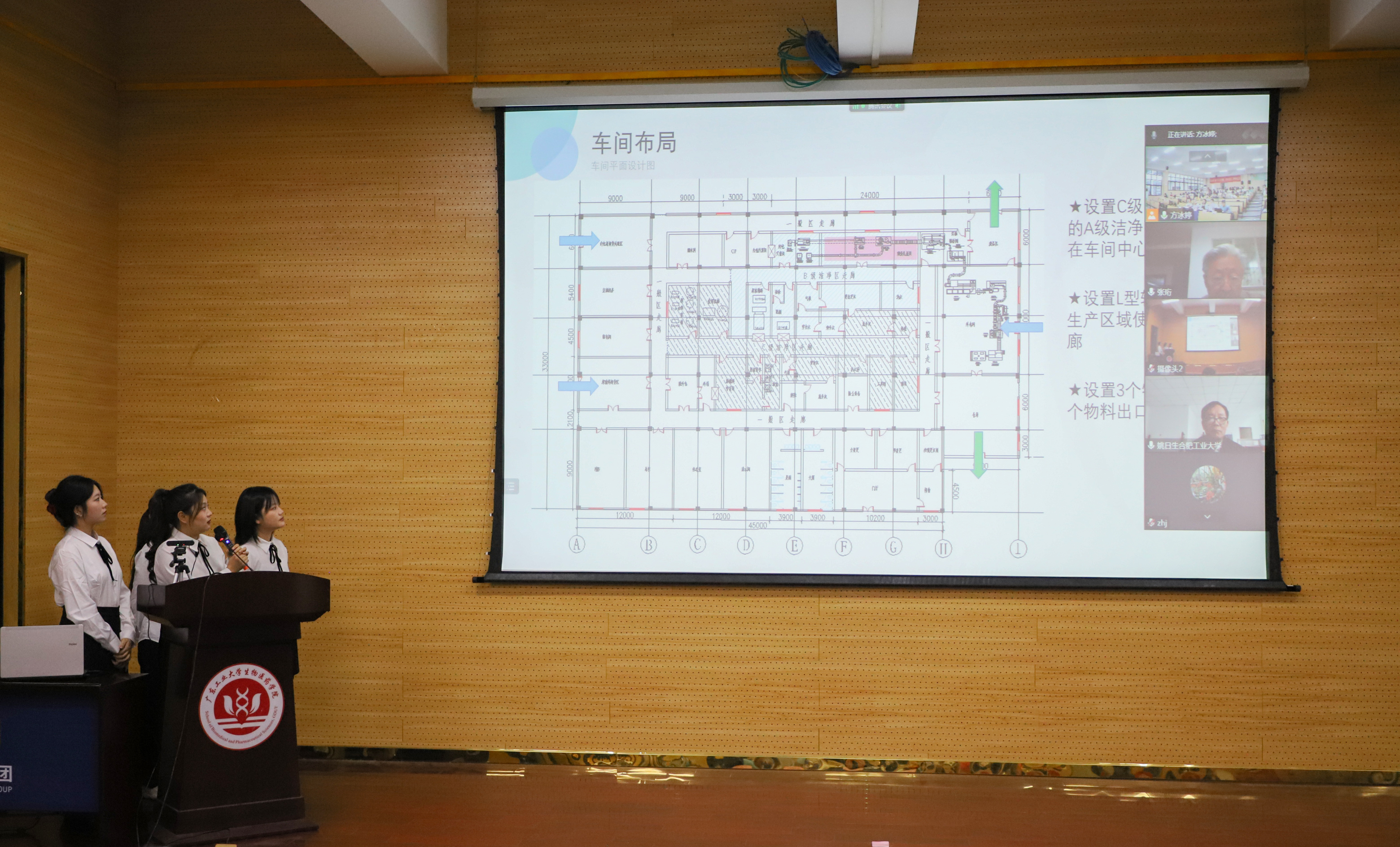 在决赛作品展示环节,18支队伍从生产工艺流程及PID控制工艺、物料衡算、设备选型、车间布置、GMP符合性、消防、安全、环保、节能等方面,以及车间三维模型等多个角度进行了充分展示,并回答了专家提问。