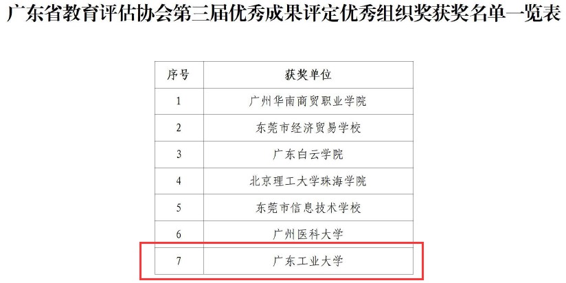 近日,广东省教育评估协会公布了第三届优秀成果奖获奖名单,共评选出优秀成果奖123项,其中特等奖2项、一等奖13项、二等奖24项、三等奖41项、优秀奖36项、优秀组织奖7项。广工共6项成果获奖,其中特等奖1项(高等教育类唯一获奖),一等奖1项,二等奖3项,三等奖1项;学校同时获评优秀组织奖。