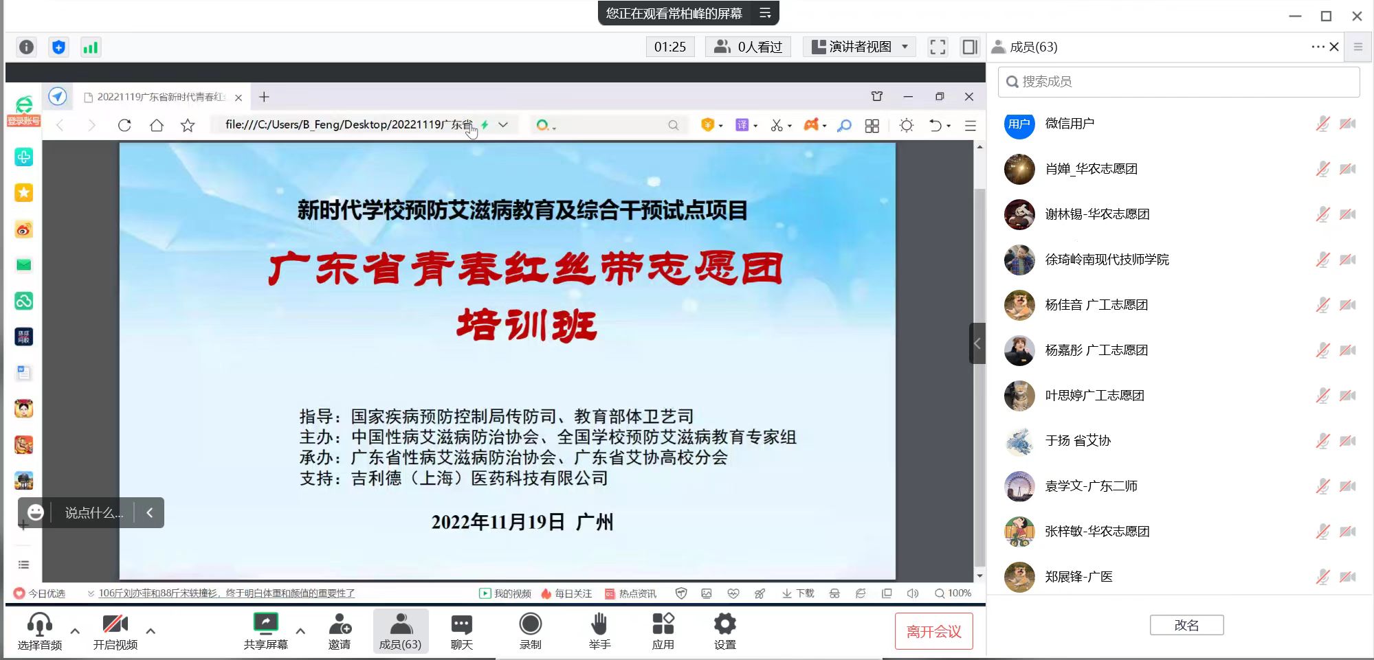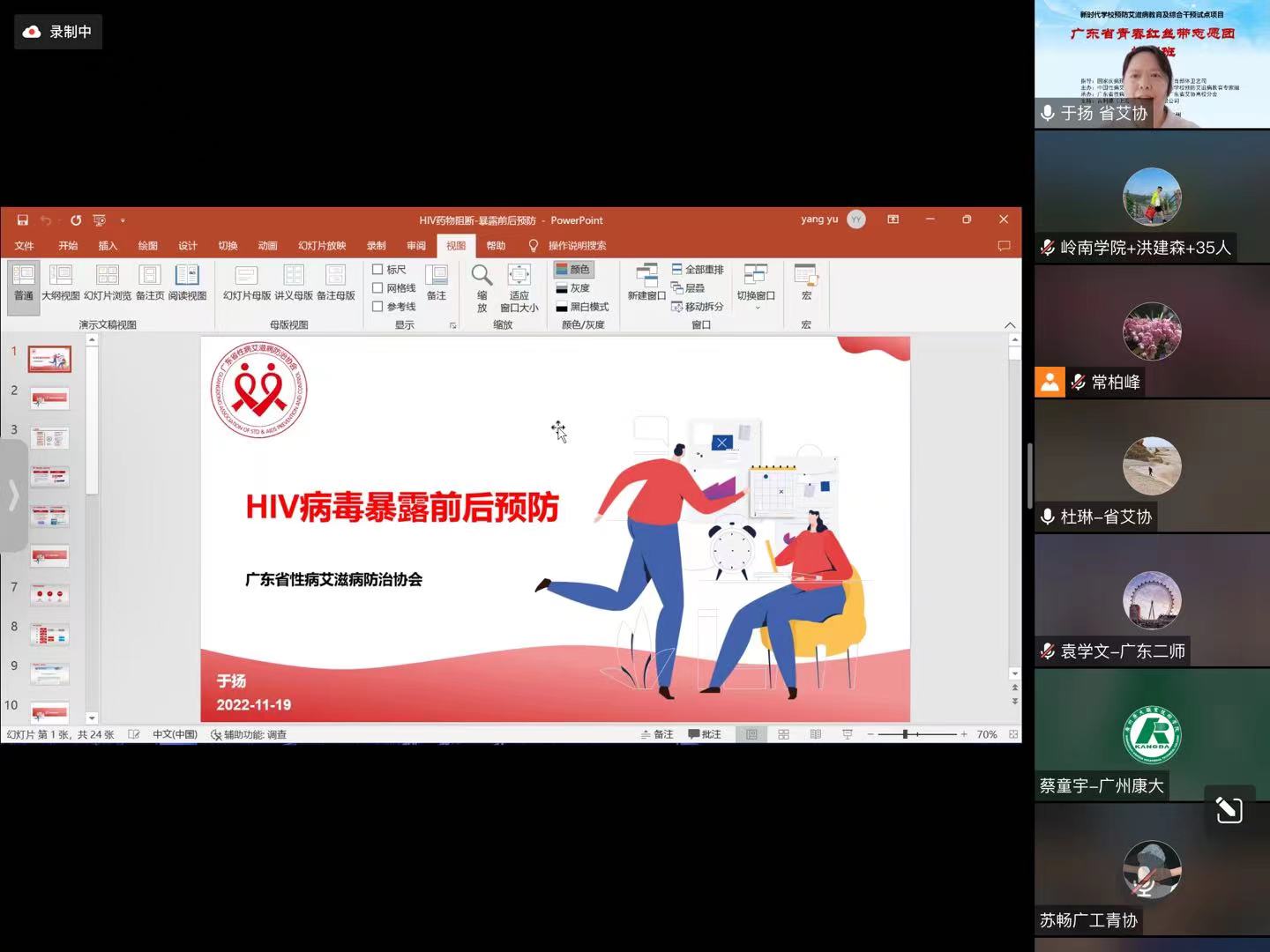 在11月19日上午,广工青春红丝带志愿团成员参加了广东省性病艾滋病防治协会组织的青春红丝带志愿团培训班。培训内容包括中艾协、省艾协的负责人和有关专家对项目的介绍及讲授了性病艾滋病相关知识,明确了项目的具体工作和任务要求。广工青春红丝带志愿团的成立体现了“依靠青年、服务青年”的志愿奉献精神,通过培训明确任务,增强认知,提高社会责任感,为做好新时代学校预防艾滋病教育及综合干预试点项目工作奠定良好的基础。