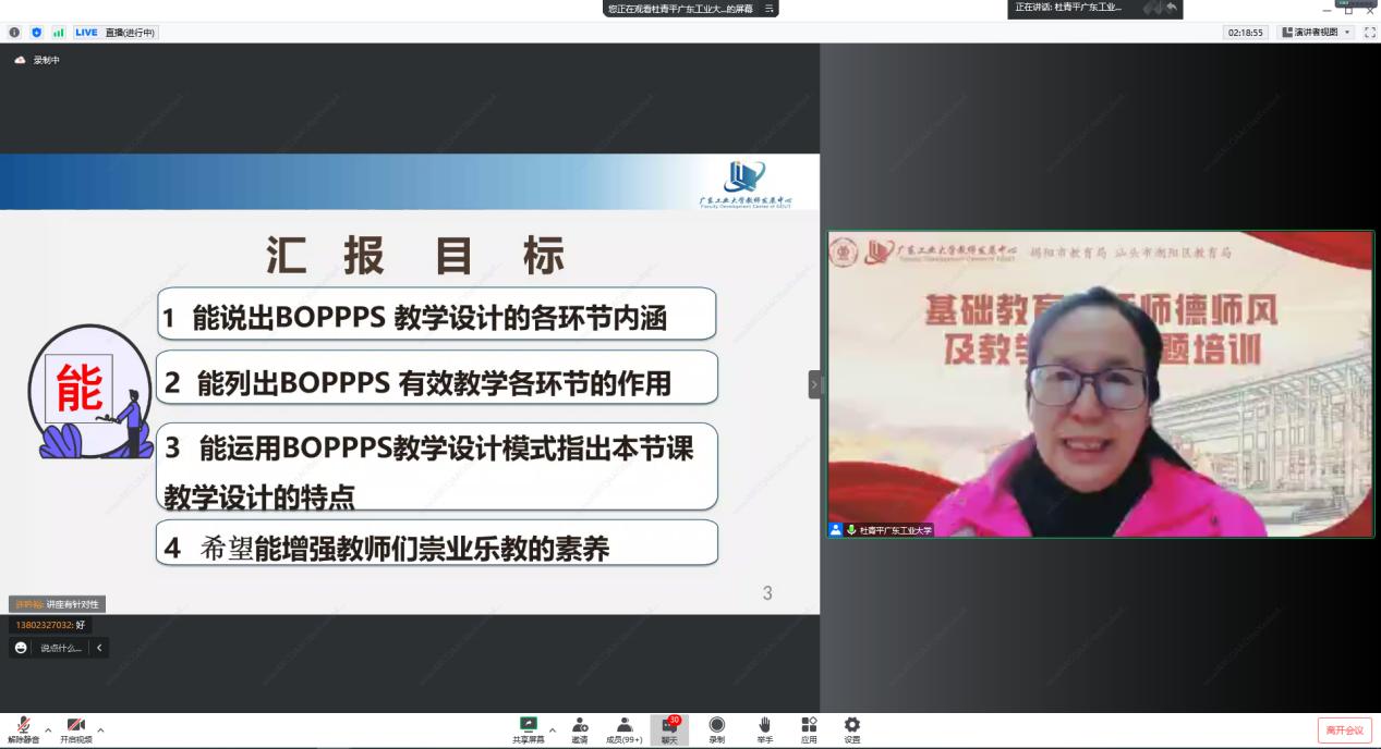 杜青平作题为“崇业乐教,做因材施教、与时俱进的育人者——论BOPPPS有效教学设计”的教学技能专题培训。她详细分析讲解了BOPPPS有效教学的设计理念及BOPPPS六个模组,并结合基础教育中丰富案例讲述了各教学模组内涵、作用和创新方式,以及以目标为坐标、以学生为中心的BOPPPS有效教学设计的特点。最后还以风趣幽默的语言-- “匠心磨好‘金刚钻’,痴心育成‘瓷器活’”来激发广大教师不断努力提升教学技能。杜青平授课内容丰富,实用性强,参训老师们更好地领会了BOPPPS教学模式有效运用的方法和技能,这将使他们今后的教学课堂更加充实、活跃和富有成效。