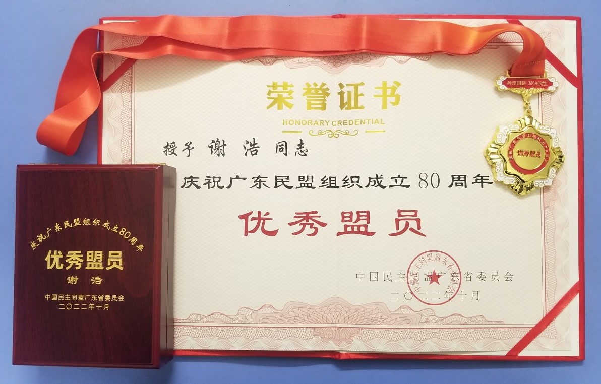 12月23日,广东民盟组织成立80周年大会在广州举行。大会对为广东民盟事业发展作出突出贡献的先进集体和个人进行了表彰,我校民盟基层委副主委谢浩被授予“优秀盟员”荣誉称号,据悉,全省共有80名同志被授予该荣誉称号。