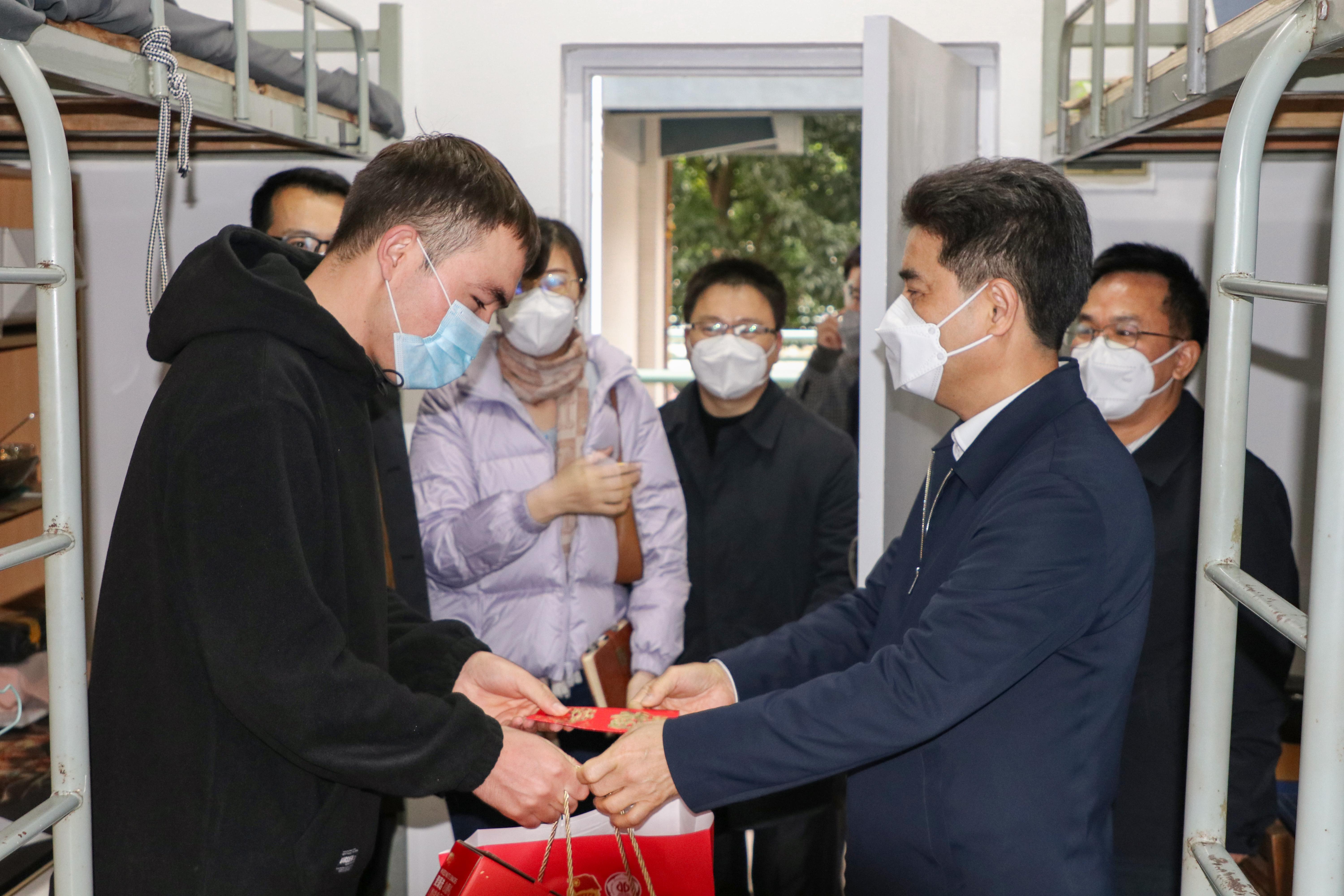 “遇到什么困难和问题,要及时反馈。”“同学们要合理规划假期时间,充实自己。”在学生社区,胡钦太、邱学青看望了寒假留校学生代表,询问同学们留校期间的科研安排与时间计划,提醒他们注意出行安全。勉励同学们充分利用好假期时段学习充实自己,适度锻炼的同时做好个人防护。并代表学校向同学们送上新春慰问礼包,祝福大家兔年新春快乐。在少数民族学生教育管理办公室、医院等单位、部门,校领导慰问了少数民族学生辅导员老师、医务工作人员等,嘱咐他们遇到什么困难与问题要及时反馈,并致以亲切关怀与新春祝福。