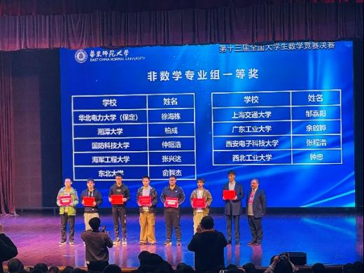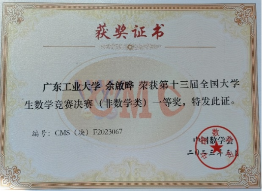 第十三届全国大学生数学竞赛决赛于3月25日在华东师范大学举行,广工在本次比赛取得历史性突破,斩获全国一等奖1项、全国三等奖1项。广工余啟晔同学(20级机电工程学院机械设计制造及其自动化专业)荣获非数学类全国一等奖,吴英俊同学(18级自动化学院自动化专业)荣获非数学类全国三等奖,这是广工首次获得该项竞赛的全国一等奖。该项竞赛竞争激烈,非数学类初赛共有全国的181654人报名参赛(全国一等奖仅69个)。余啟晔同学和吴英俊同学在2021年的初赛中表现优异,获得了此次代表广东省参加全国大学生数学竞赛非数学类决赛的资格(全省仅11人)。