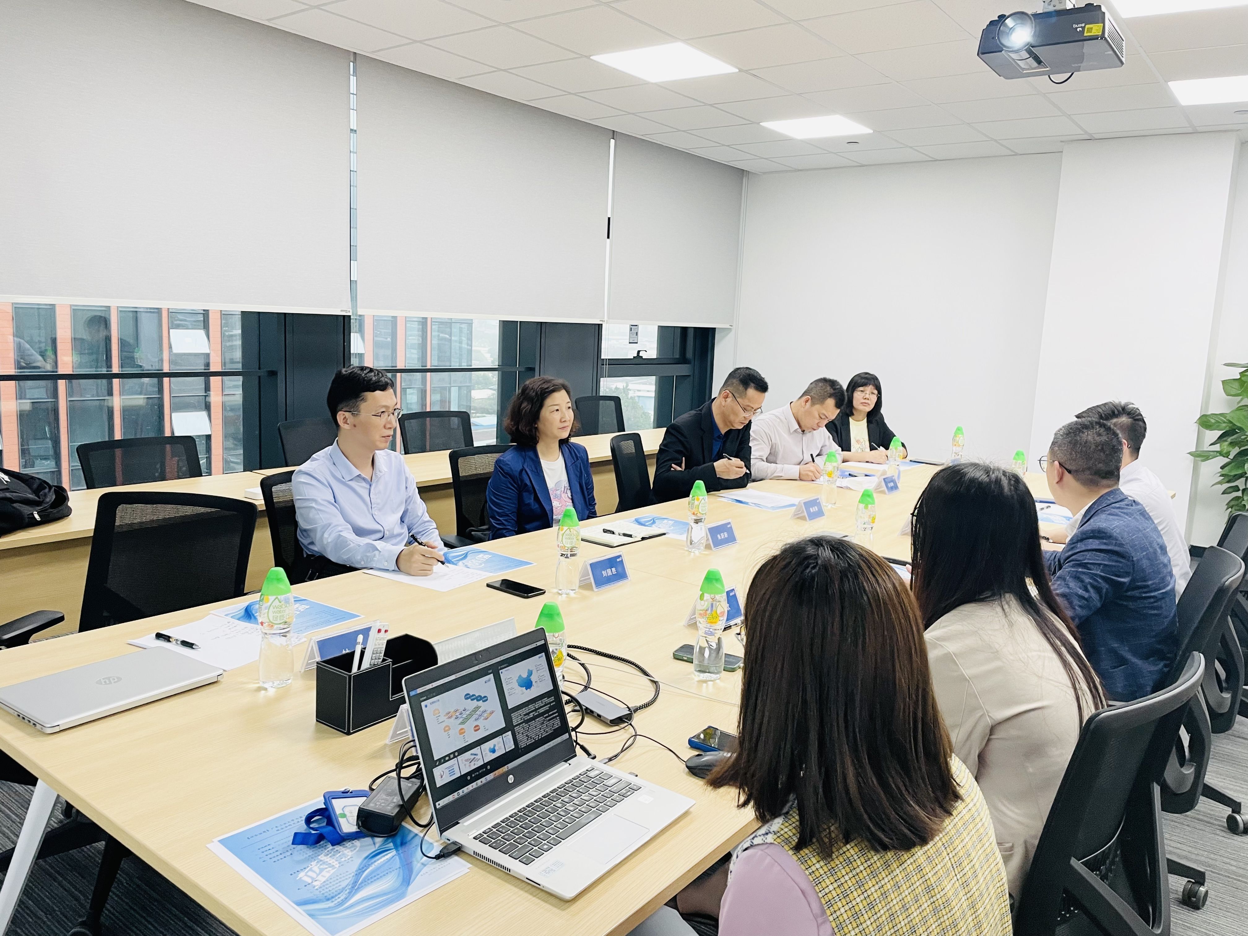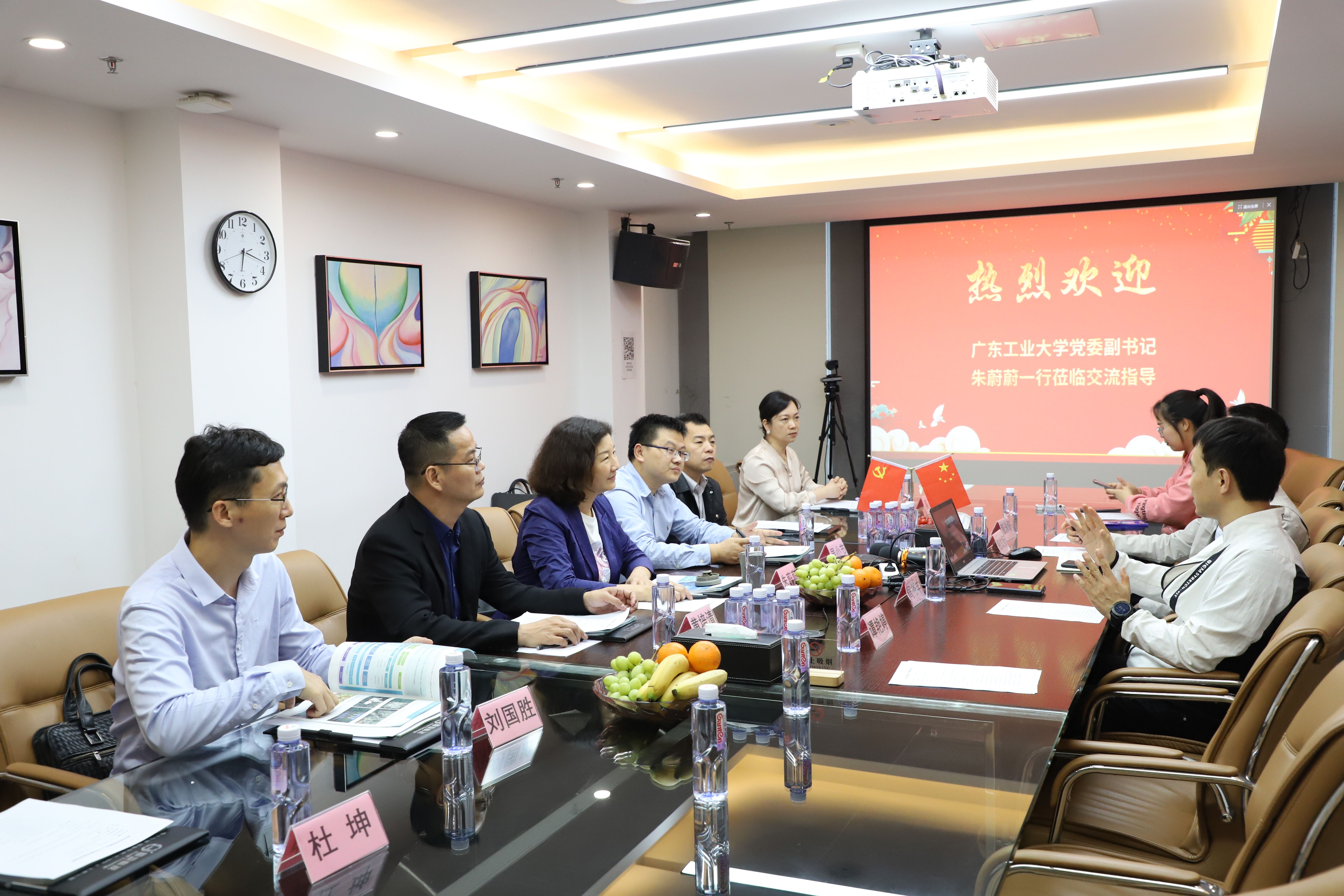 在广东国地规划科技股份有限公司,朱蔚蔚一行参观了国地科技数字展厅,了解国地科技的发展历程、定位、使命、价值观、愿景和业务优势。座谈会上,朱蔚蔚为校友企业取得的成绩感到骄傲,诚挚邀请校友在学校本科办学65周年之际回母校参加相关活动。她表示,学校高度重视校友服务与联络工作,全力支持校友企业的发展成长,希望双方能够进一步深化合作、协同育人,共同助力广东高质量发展。国地科技董事长介绍了公司概况、人才需求、招聘要求、人才培养模式以及公司中广工校友的成长情况。双方就校企合作等方面深入交流探讨。