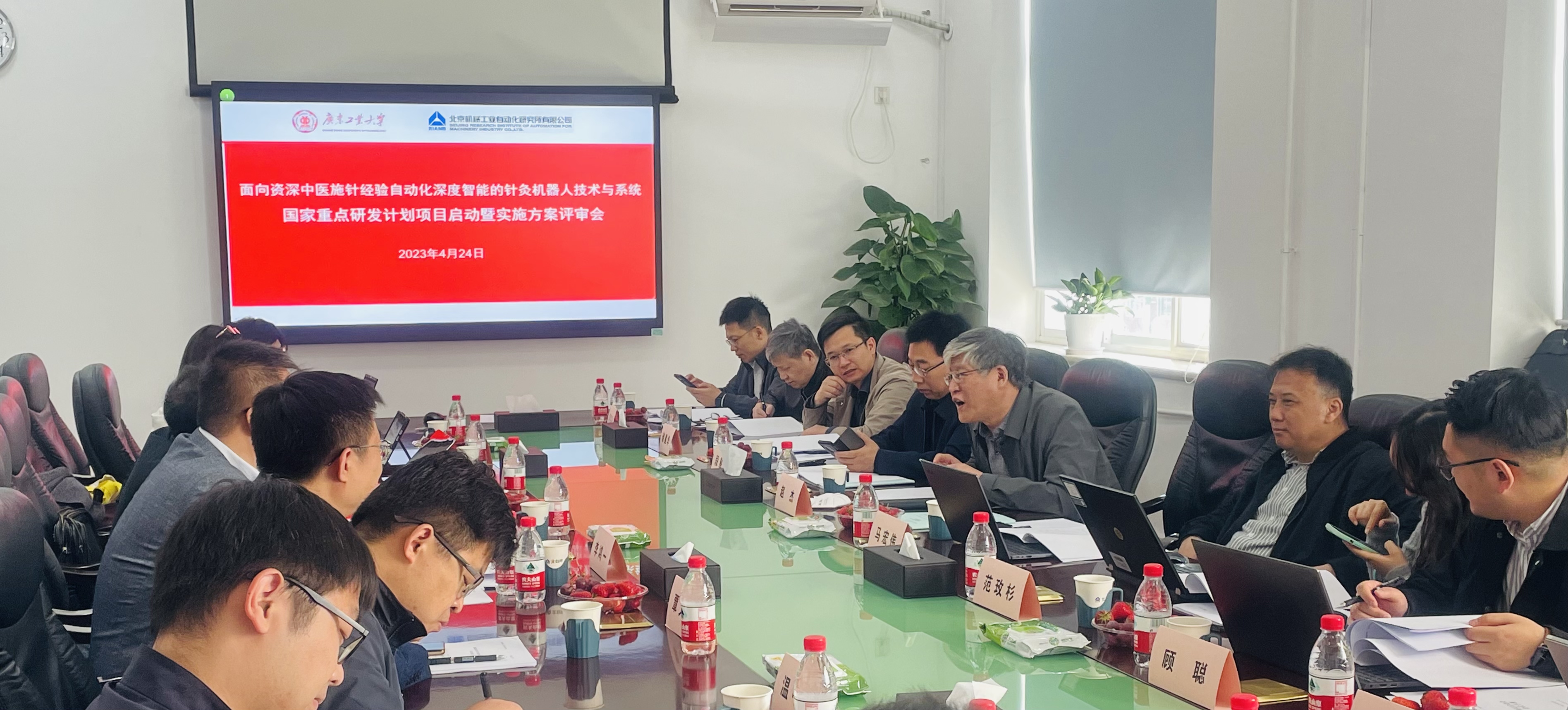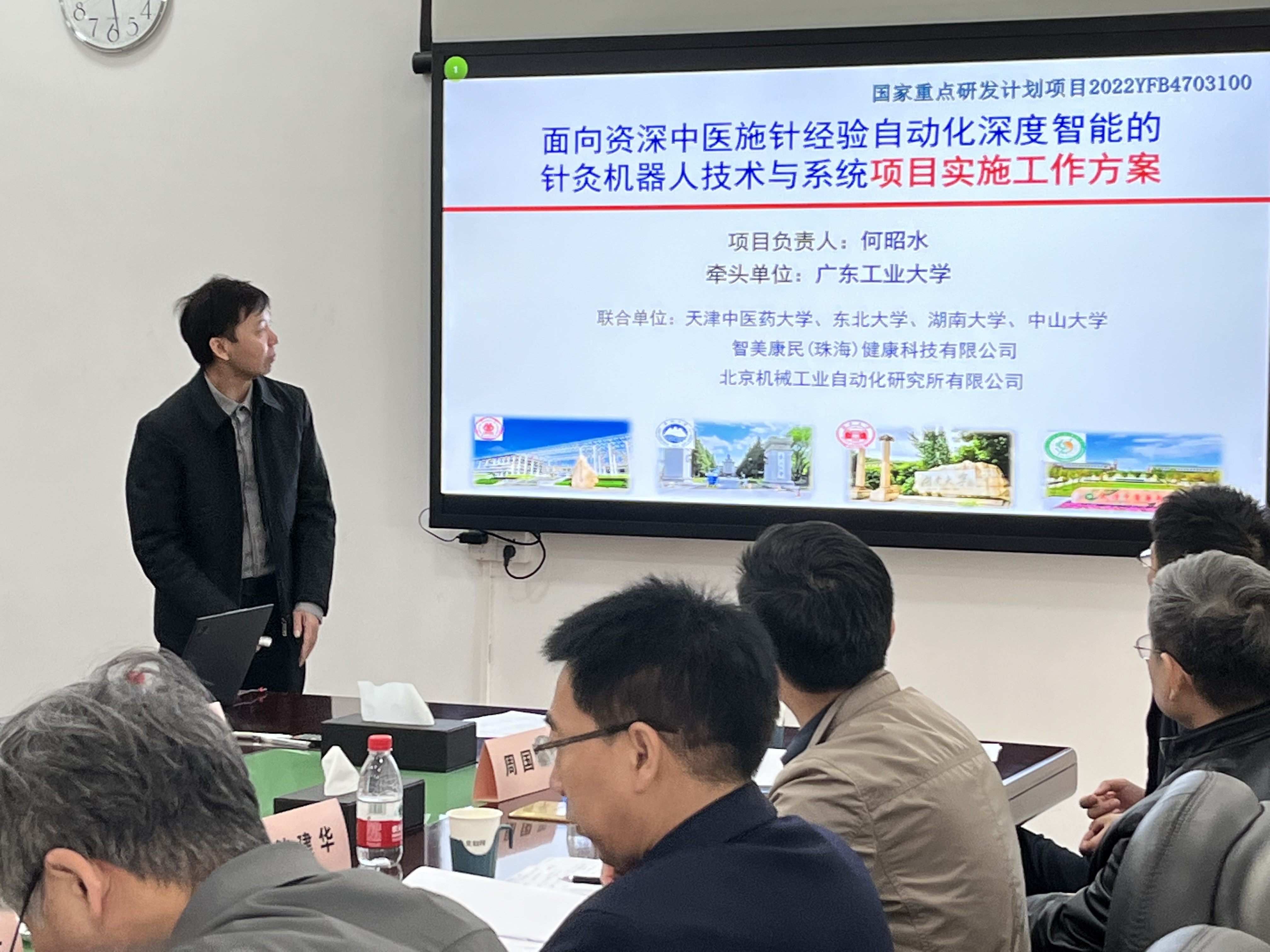 4月24日上午,由广工牵头承担的国家重点研发计划“面向资深中医施针经验自动化深度智能的针灸机器人技术与系统”项目启动会暨实施方案评审会在北京召开。出席本次会议的有国家工信部产促中心项目主管范玫杉、项目主管顾聪,国家重点研发计划“智能机器人”重点专项总体专家组组长赵杰教授,专家段星光教授,项目责任专家马宏伟教授、储建华研究员。会议特别邀请了世界针灸学会联合会主席刘保延院士,南方医科大学周国平教授,广东省科学院智能制造研究所副所长周雪峰研究员,天津中医药大学针灸推拿学院院长郭永明教授,中山大学韩瑜教授等多位专家组成员咨询指导。