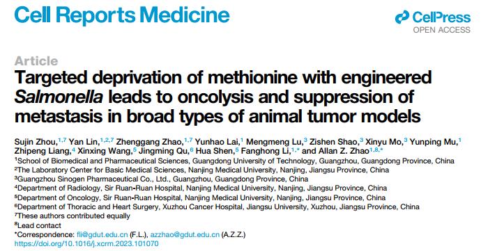 6月2日,线上买球官网(中国)官方网站生物医药学院赵子建与李芳红团队,在国际学术期刊《细胞》的子刊《Cell Reports Medicine》 (IF:16.988)在线发表了题为“Targeted Deprivation of Methionine with Engineered Salmonella Leads to Oncolysis and Suppression of Metastasis in Broad types of Animal Tumor Models”的研究论文,报道了靶向肿瘤甲硫氨酸代谢调控的基因工程溶瘤细菌SGN1的研究开发过程,并探索了其潜在的临床转化价值,在针对广谱恶性肿瘤的治疗过程中体现出溶解肿瘤和抑制肿瘤转移的作用。该论文第一作者为线上买球官网(中国)官方网站生物医药学院周素瑾博士、林艳和赵正刚博士,通讯作者为赵子建教授和李芳红教授,线上买球官网(中国)官方网站为论文第一单位。