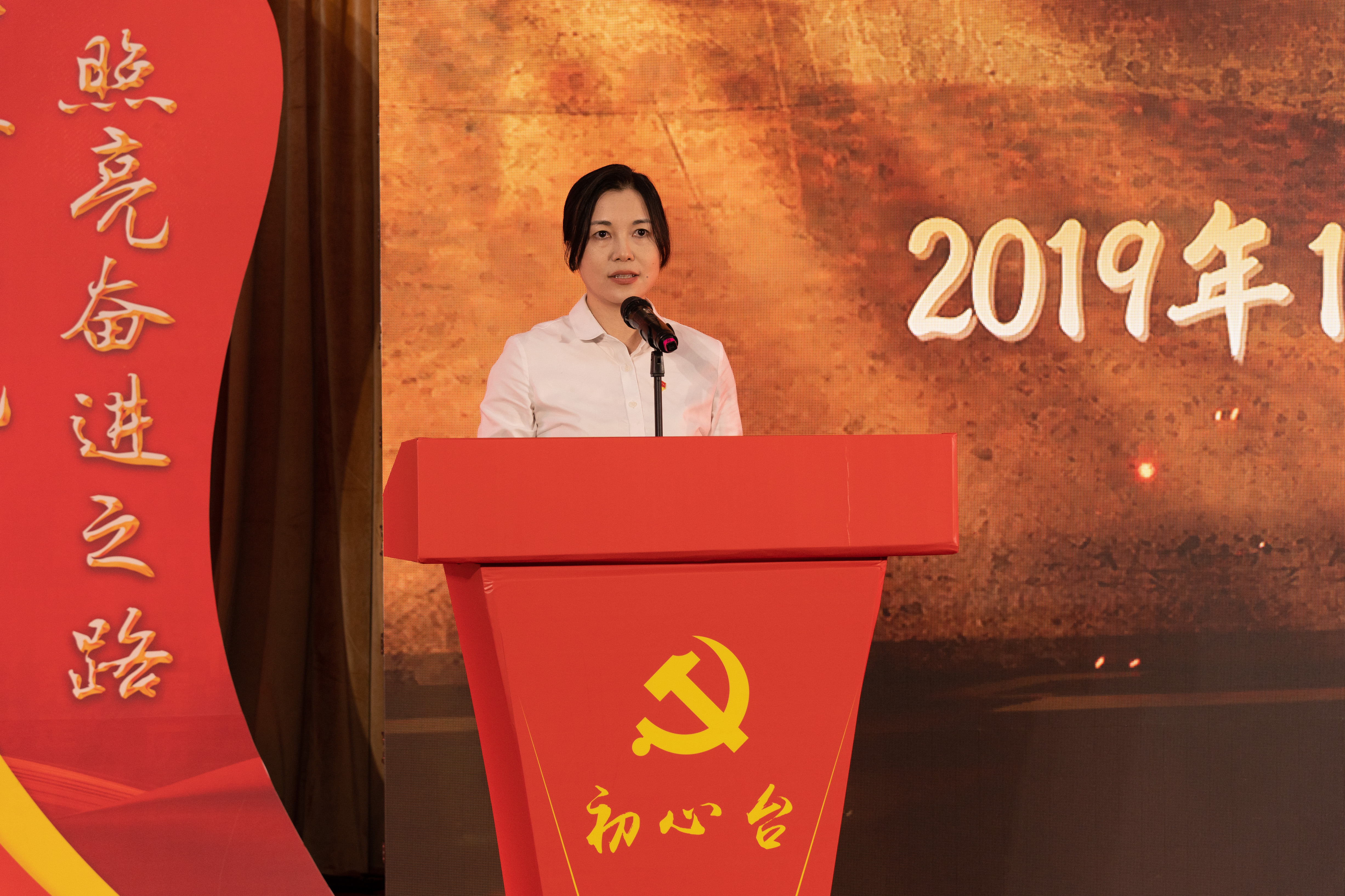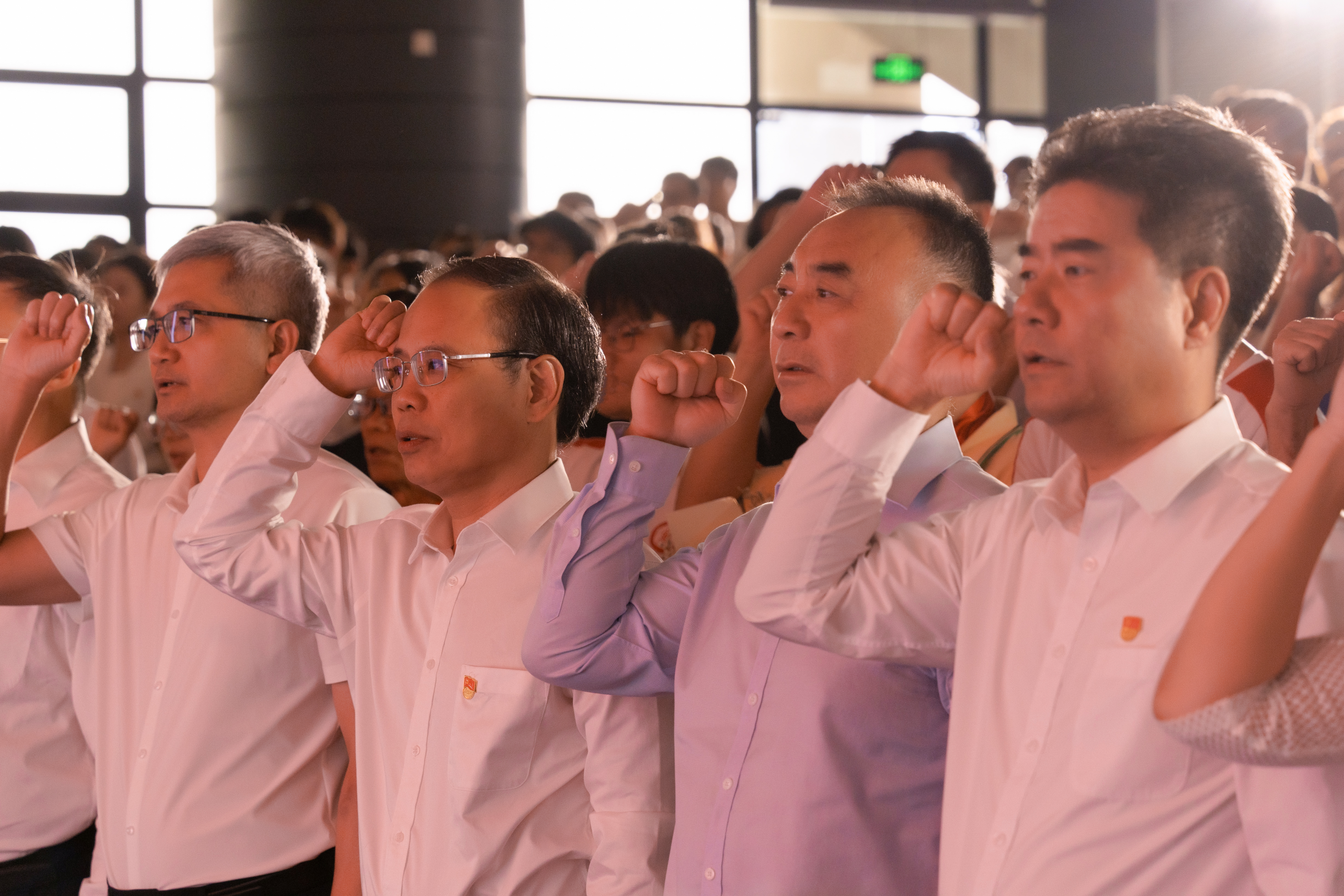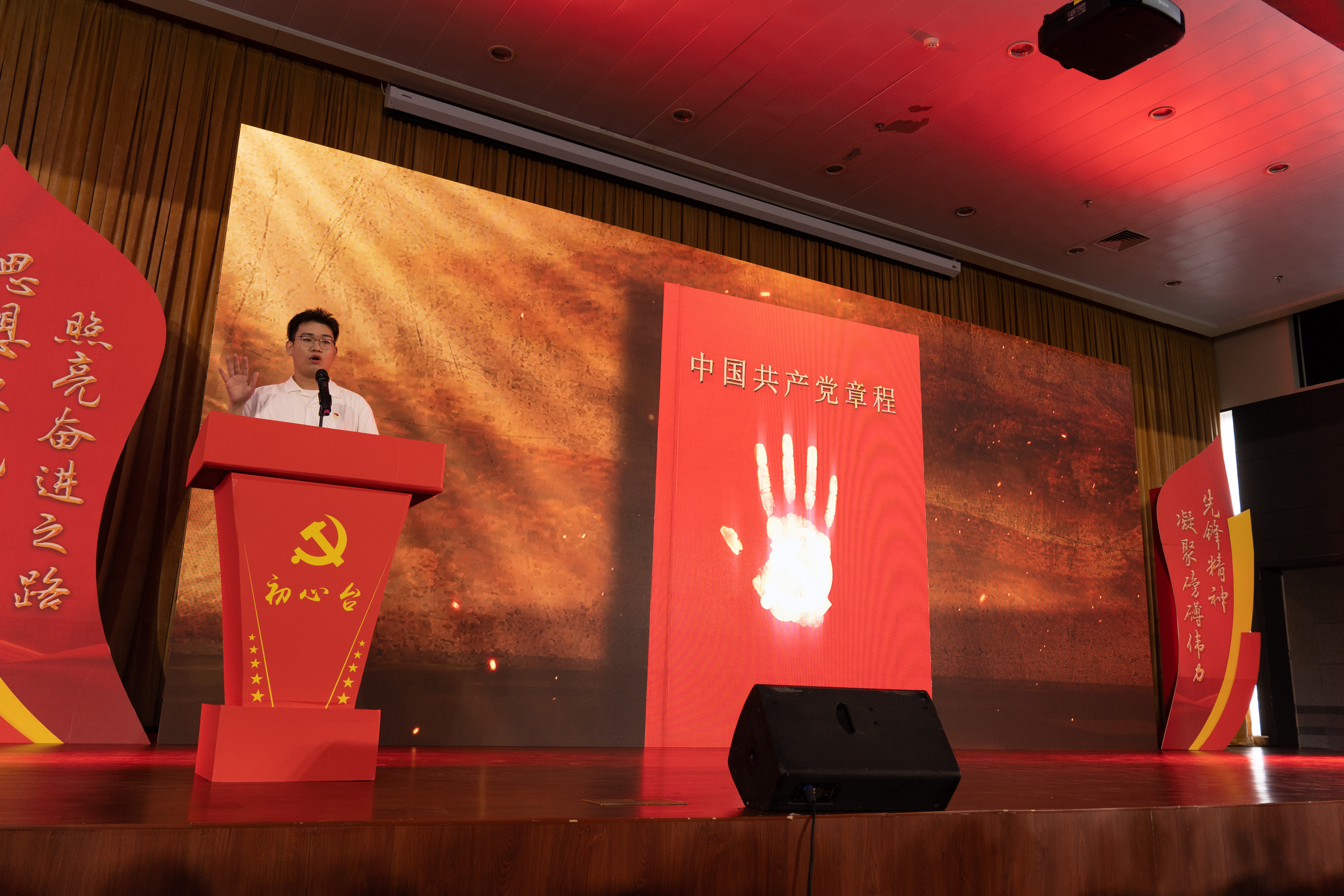 伴随着党旗最终来到主题党日的现场,在老党员赵美玉同志的带领下,全体党员高举右手,面向党旗庄严宣誓:“我志愿加入中国共产党,拥护党的纲领……”铿锵有力的誓言是党员对党的庄严承诺。