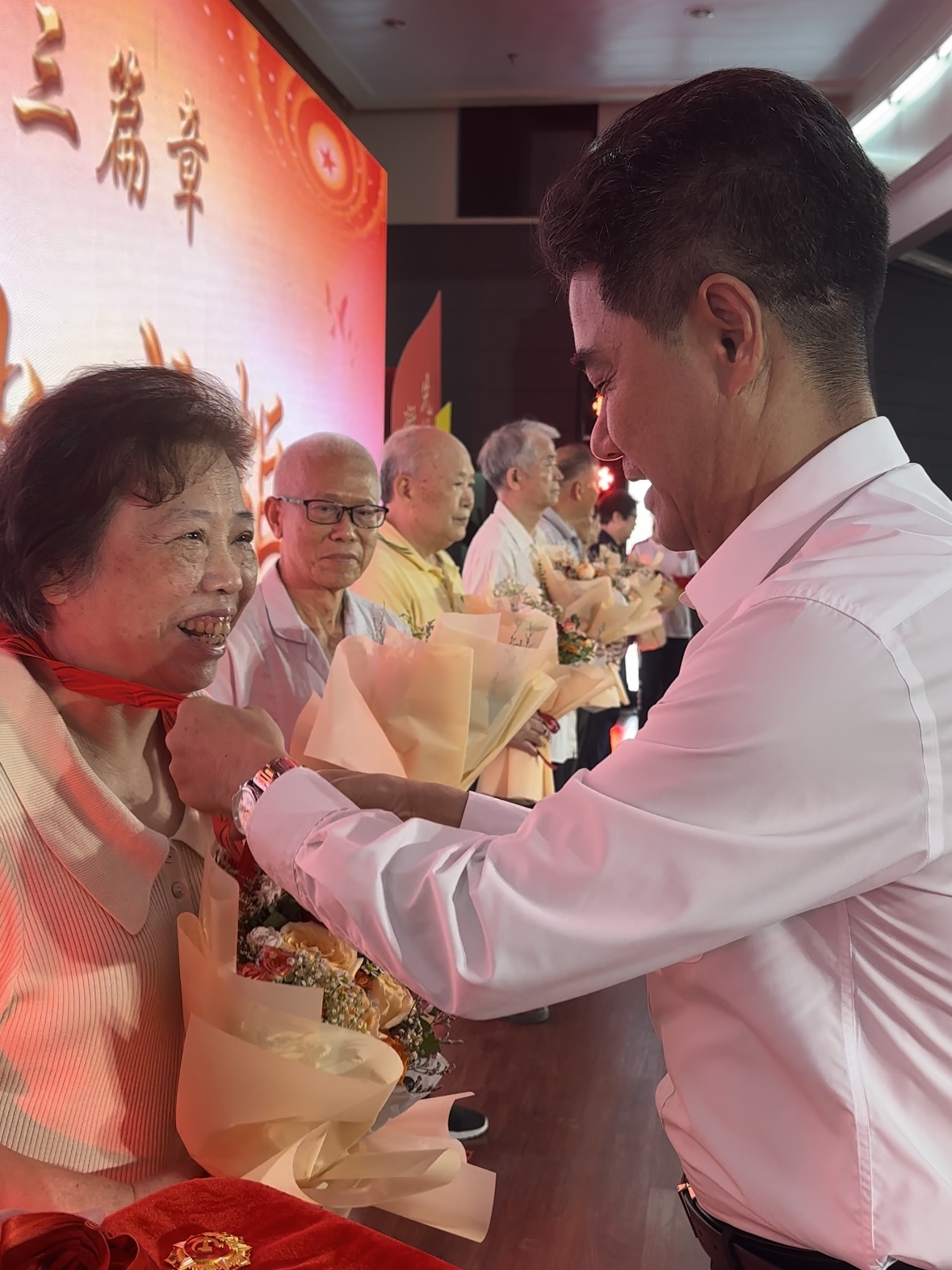 “点点星火、汇聚成炬,这就是中国力量!”广工本科办学65载,一代代广工人高唱接续奋斗的凯歌,党龄丈量了平凡的生命刻度,也成为了见证伟大的青春坐标。现场,学校党委书记胡钦太,党委副书记、校长邱学青为李遵松、梁日勤、黄安洋、陈秉照、傅建平、赵美玉、曾凡惠、周秀兰等8位老党员颁发“光荣在党50年”纪念章,学生党员为他们献上鲜花,致敬他们“满头白发风霜染,一片丹心映初心”的深厚爱党情怀和奉献精神。